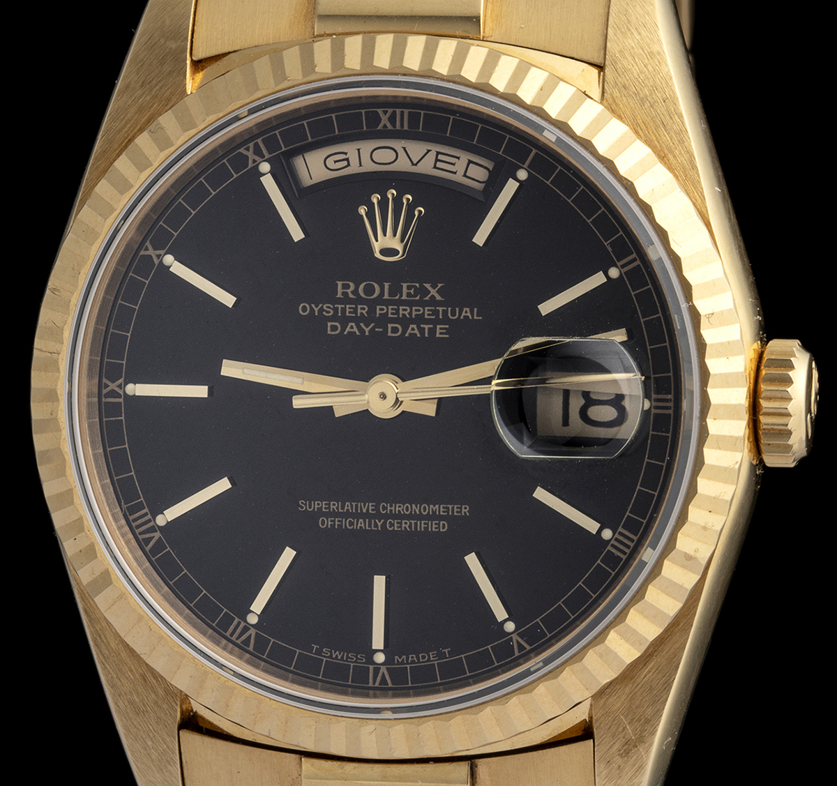 con quadrante nero, bracciale president in oro giallo 18k con déployante a scomparsa. Ref. 18238 con vetro zaffiro. Diametro della cassa 36 mm.