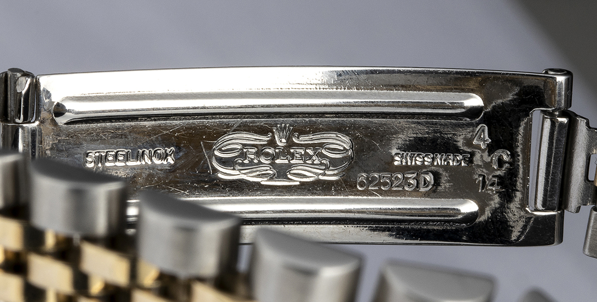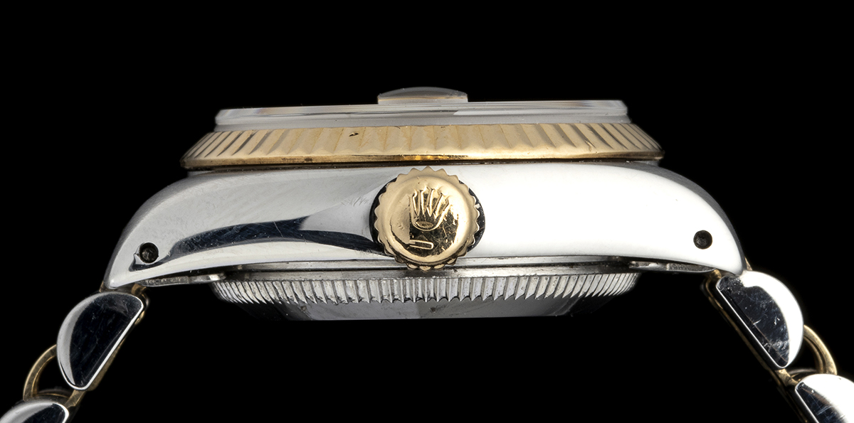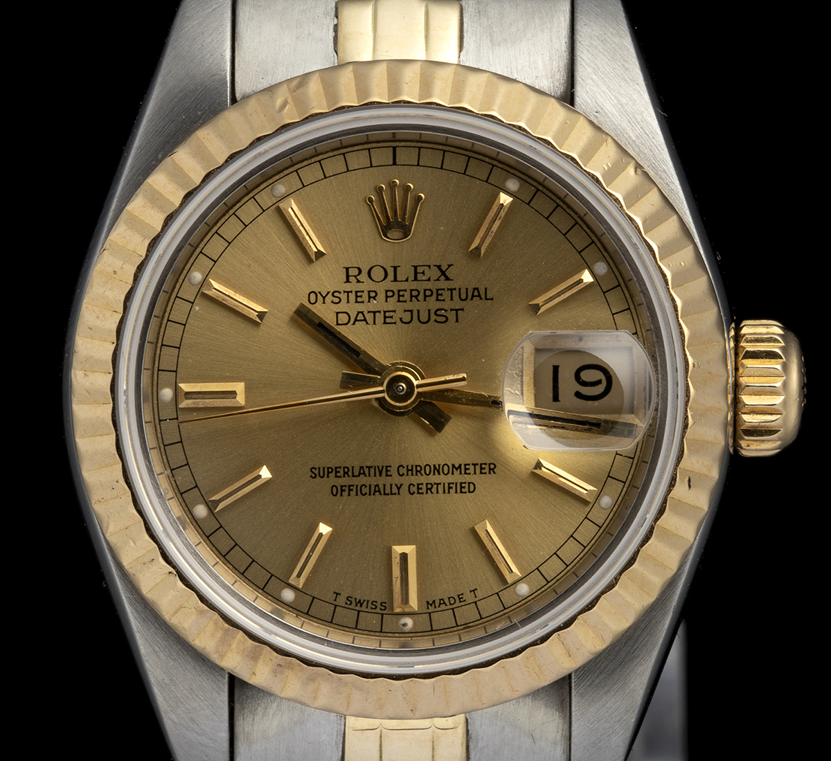 cassa e bracciale acciao e oro, quadrante champagne con indici a bastone e sfere dorate e vetro zaffiro. Bracciale Jubilee, Movimento automatico. Cassa diametro 26 mm e cinturino con chiusura deployante.