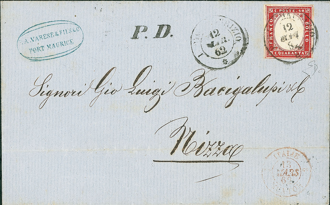 ANTICHI STATI - Sardegna - 40 cent con filetto di riquadro (pos.12) - lettera da Porto Maurizio a Nizza del 12.3.62 - Diena (16E)