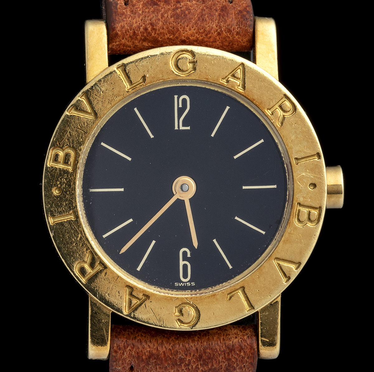 modello BVLGARI BVLGARI Solotempo con movimento meccanico al quarzo, cassa in oro giallo 18k, lunetta con doppio logo, quadrante nero con indici applicati a bastone, numeri arabi ore 6 e ore 12. Cassa e fibbia in oro con cinturino in pelle, referenza 2672.