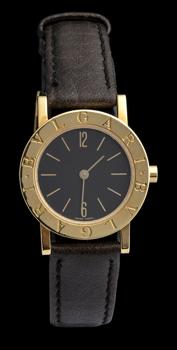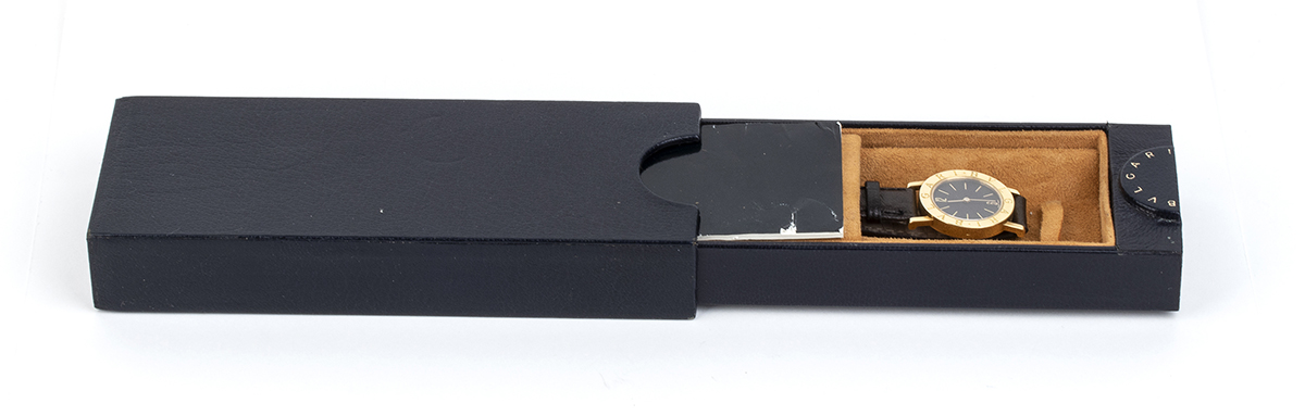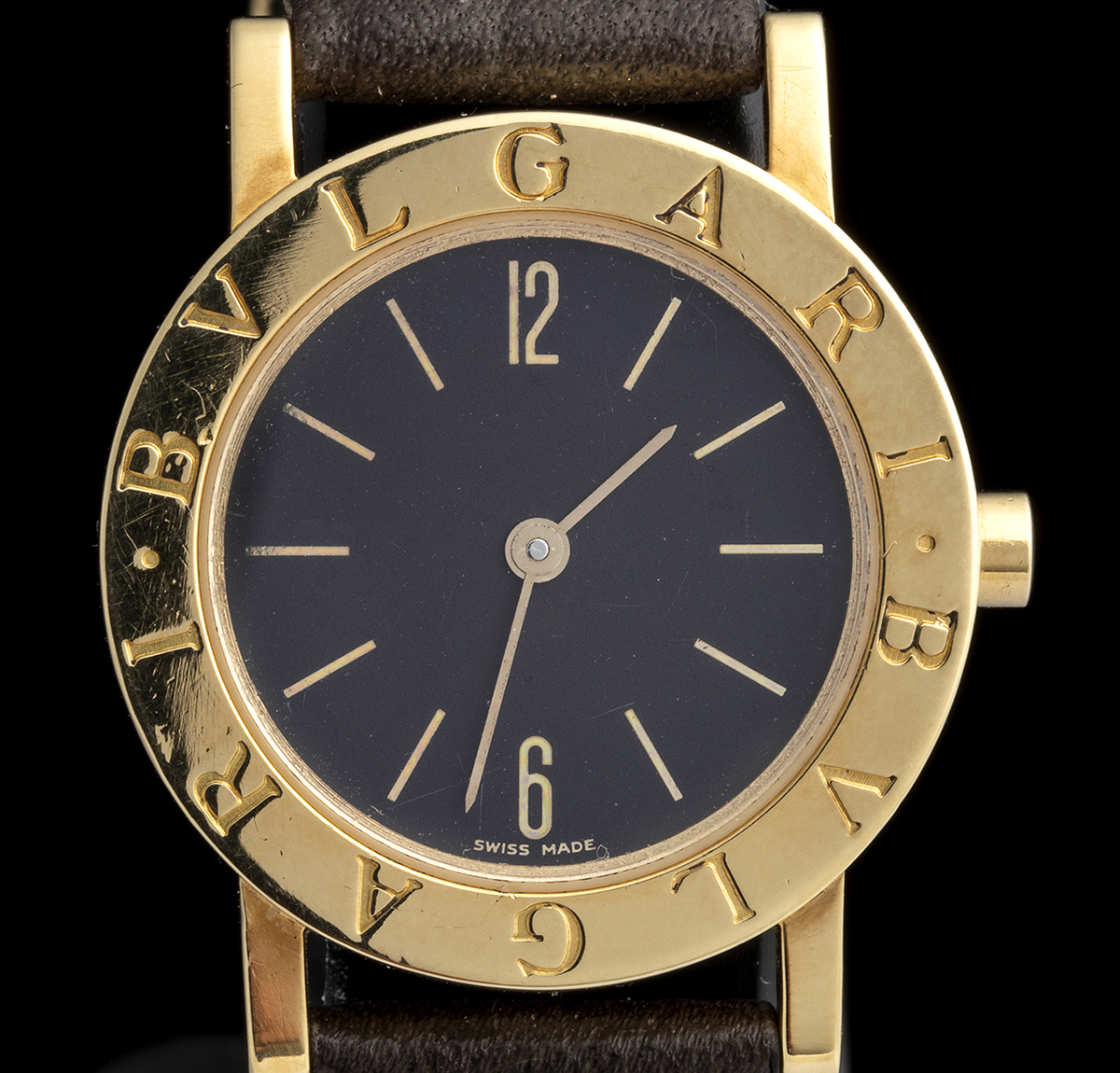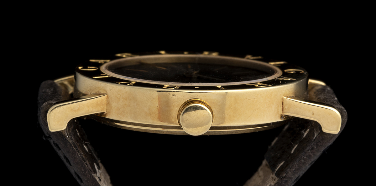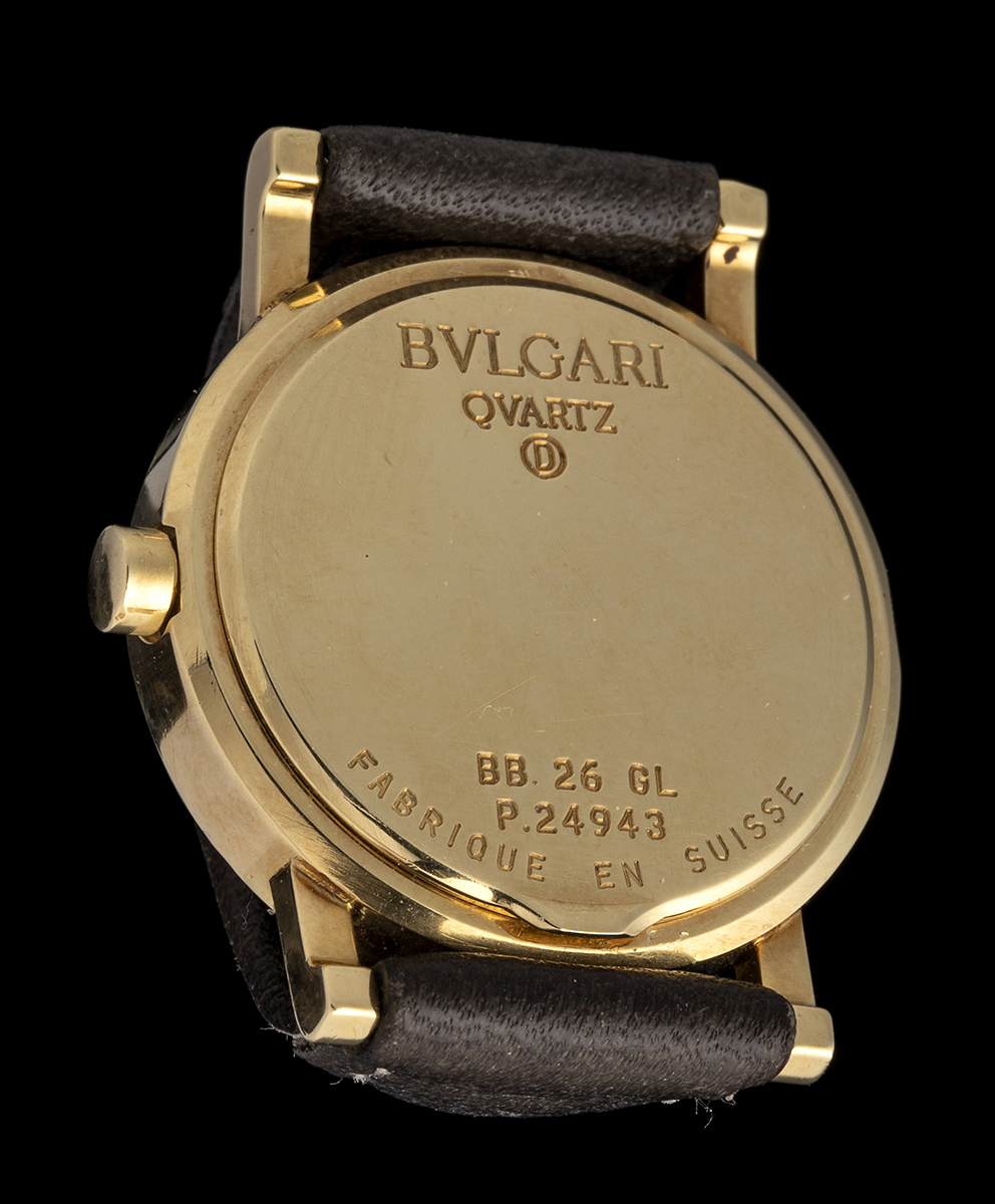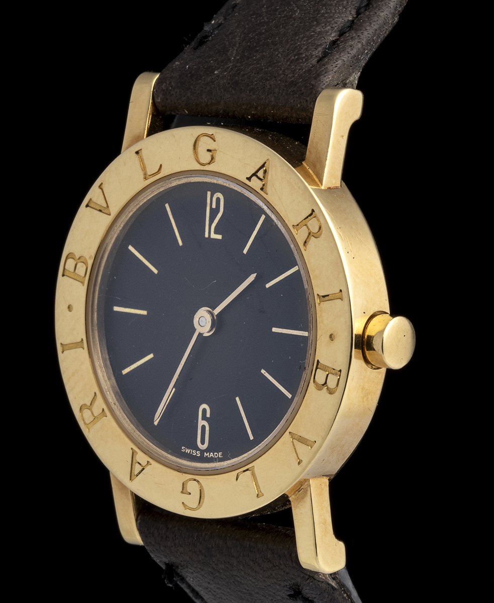 modello BVLGARI BVLGARI Solotempo con movimento meccanico al quarzo, cassa in oro giallo 18k, lunetta con doppio logo, quadrante nero con indici applicati a bastone, numeri arabi ore 6 e ore 12. Cassa e fibbia in oro con cinturino in pelle, referenza BB 26 GL P. 24943.