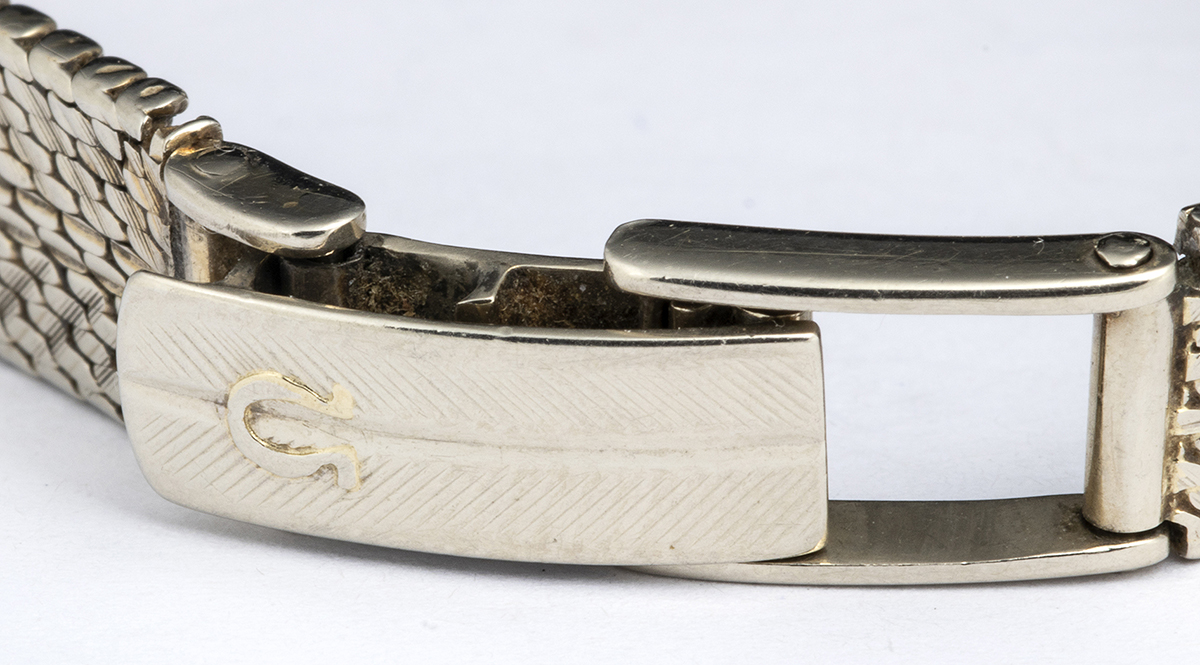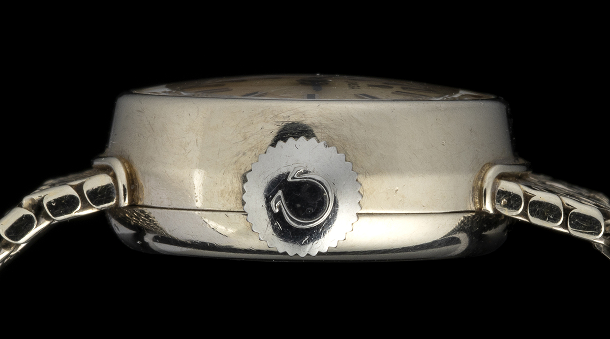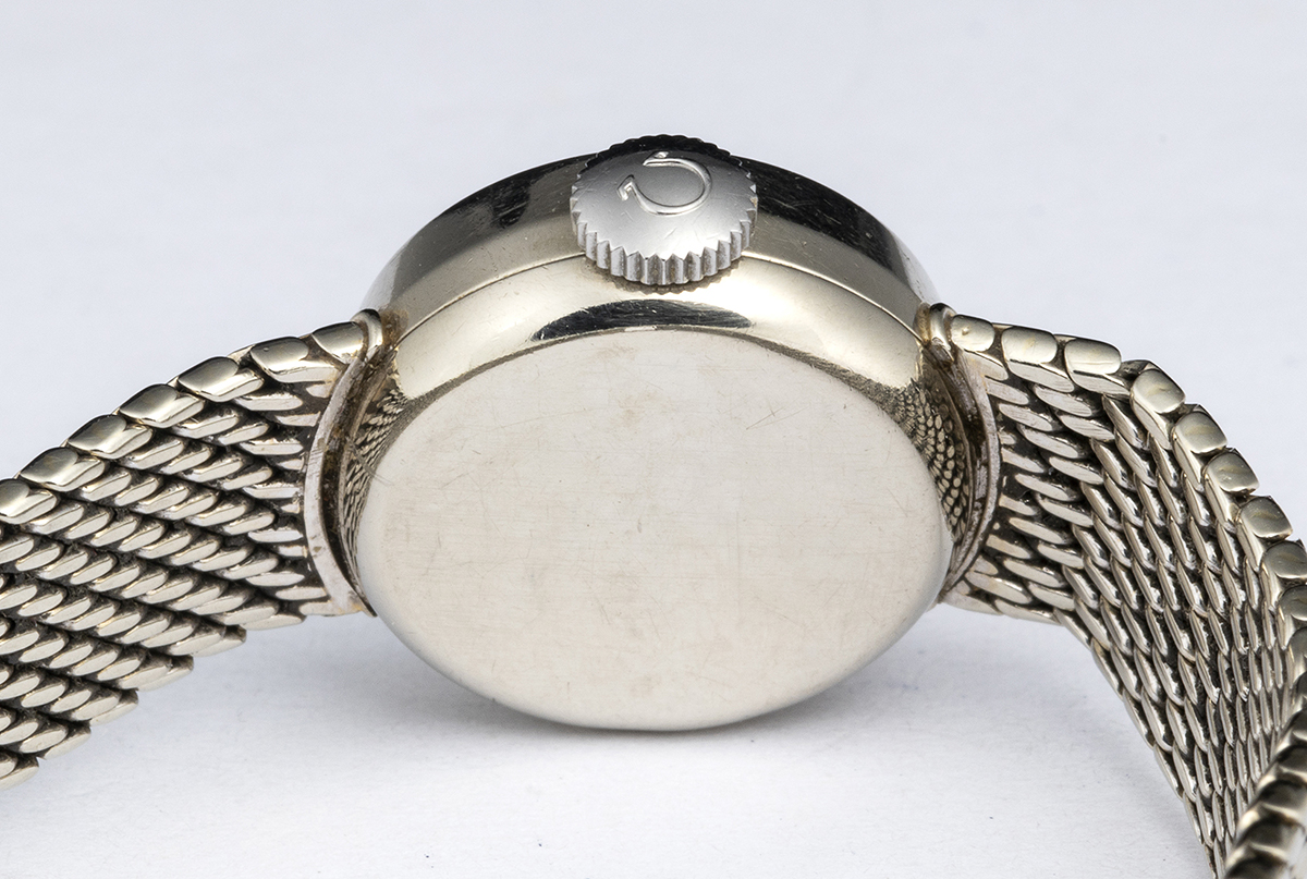 cassa e bracciale in oro bianco 18k, quadrante champagne con indici a bastone e sfere dorate. Movimento a carica manuale punzonato "OmegaWatch Co. Seventeen 17 Jewels" calibro 483. Cassa nr. 515783 - 7087GY. Bracciale punzonato "750" e logo Omega.