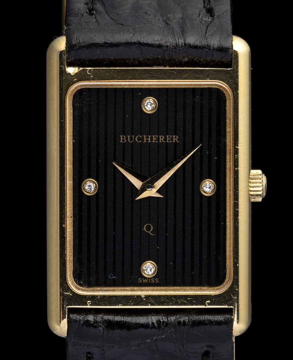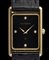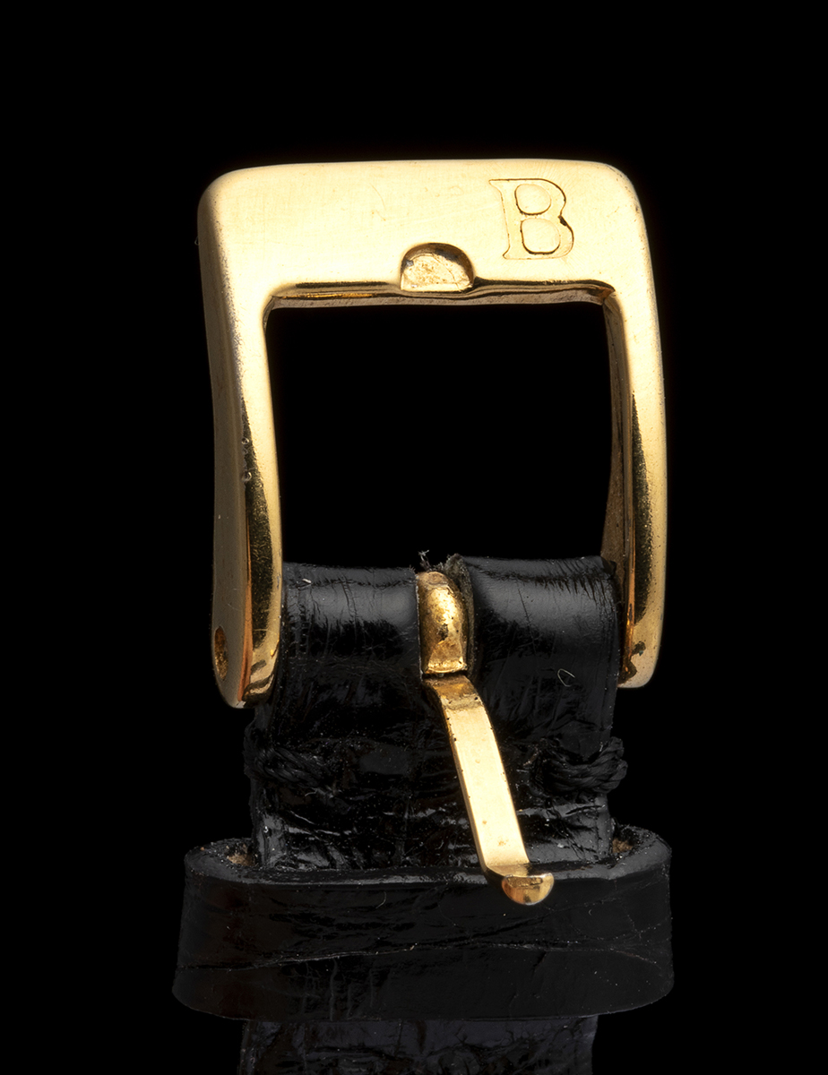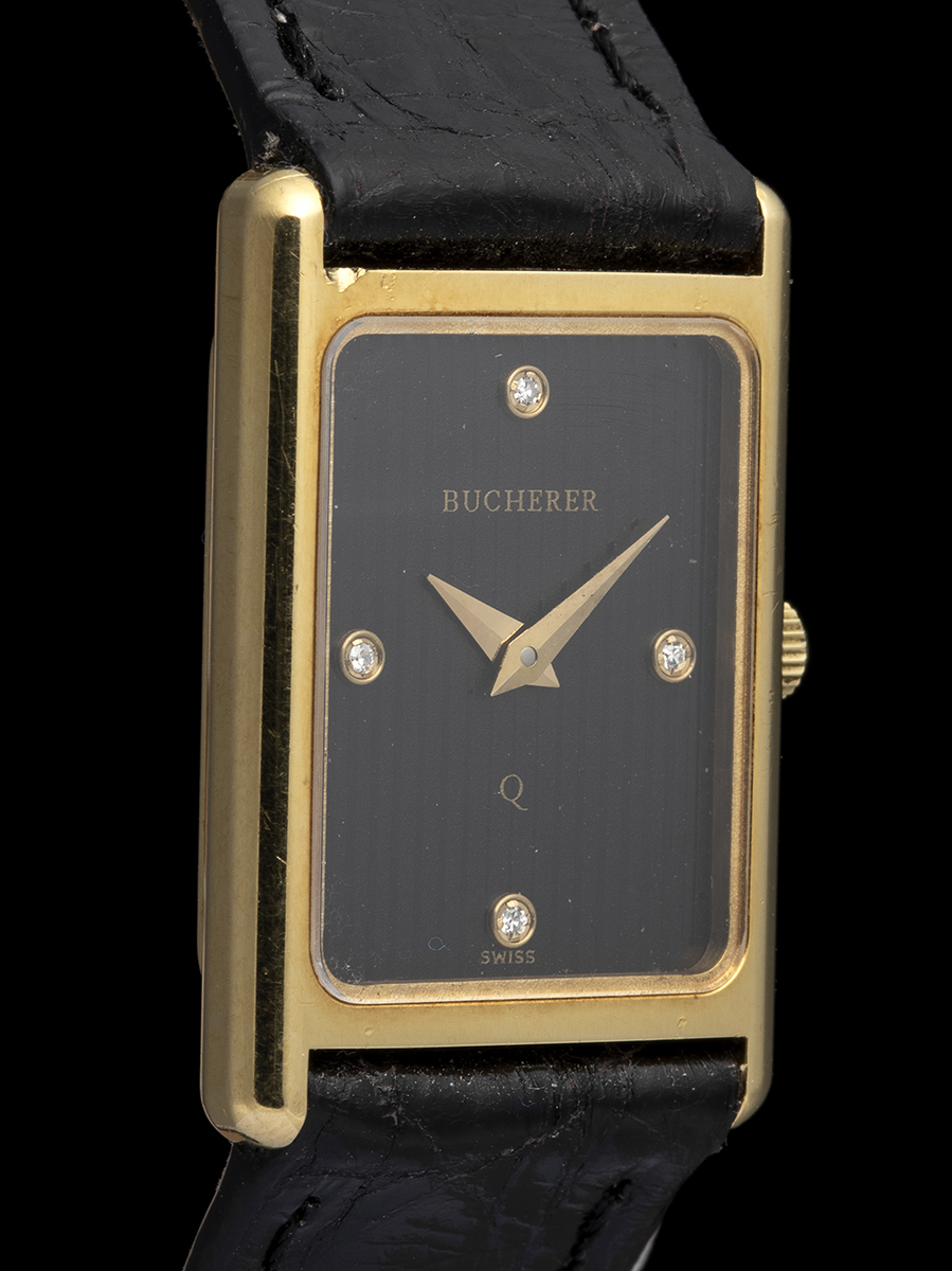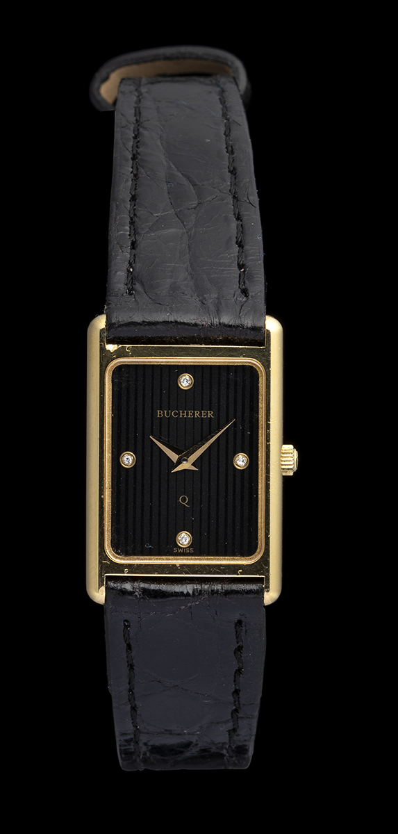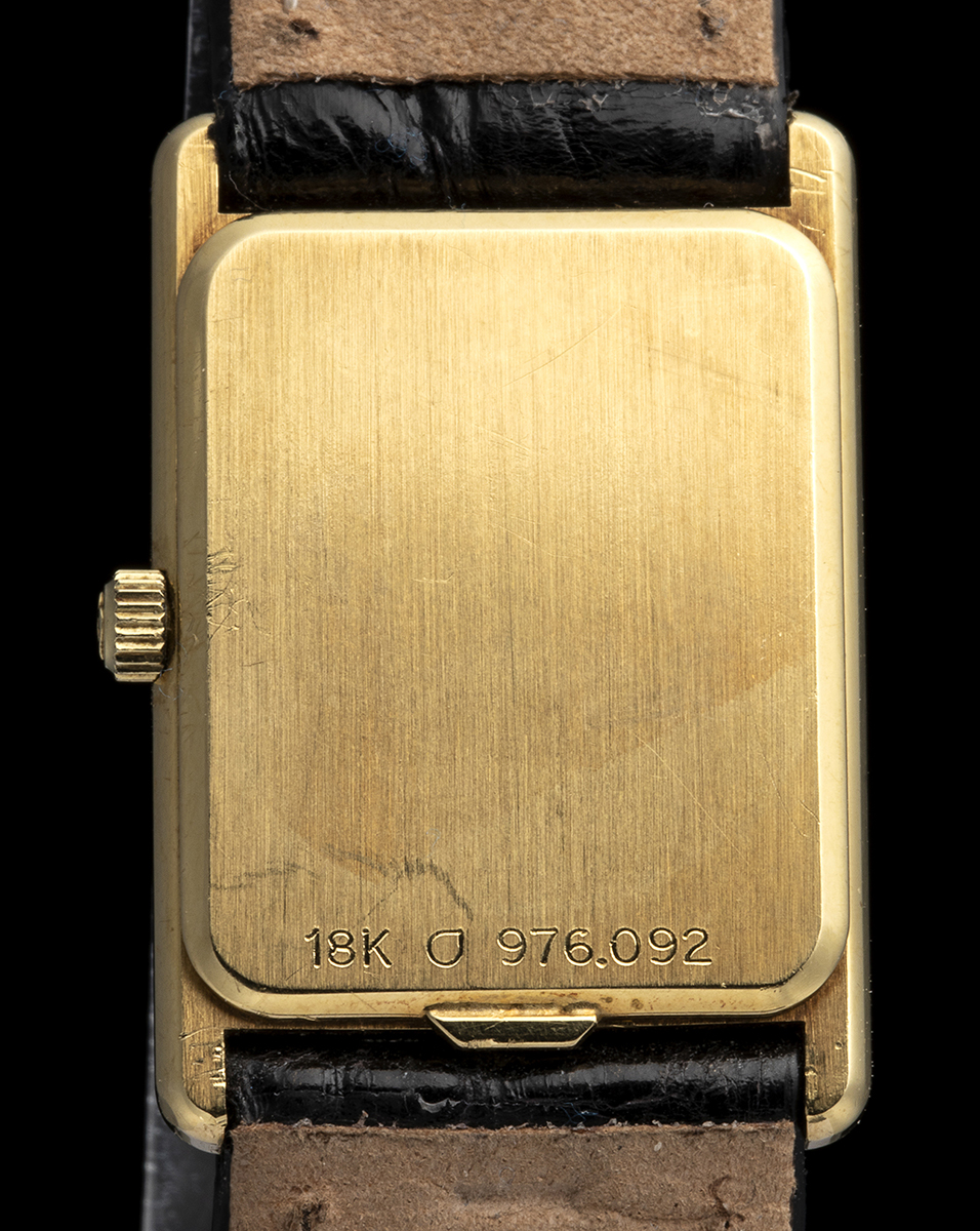 cassa rettangolare in oro giallo 18k, quadrante nero con diamanti alle ore 3-6-9-12, movimento al quarzo. Dimensioni cassa: 17,5 x 25,5 mm (corona esclusa). Bracciale in pelle. Il fondello esterno presenta la scritta: 8377 10 976092 18k.