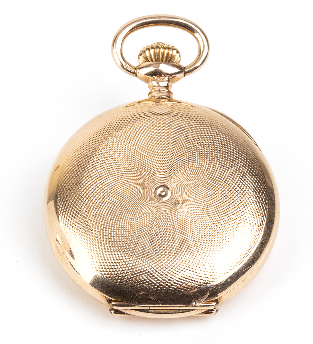 cassa savonette in oro 14k decorata a guilloché, quadrante in smalto bianco con numeri Romani e sfere dorate. Movimento con scappamento ad ancora e carica a remontoir firmato "Zenith". Cassa nr. 086112, diametro 25 mm. Catena in oro giallo 18k punzonata "750 - 1 stella AR - unoaerre", lunghezza 42 cm, peso 12,6 gr.