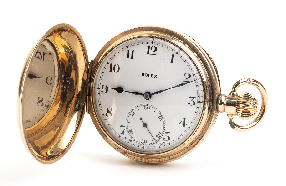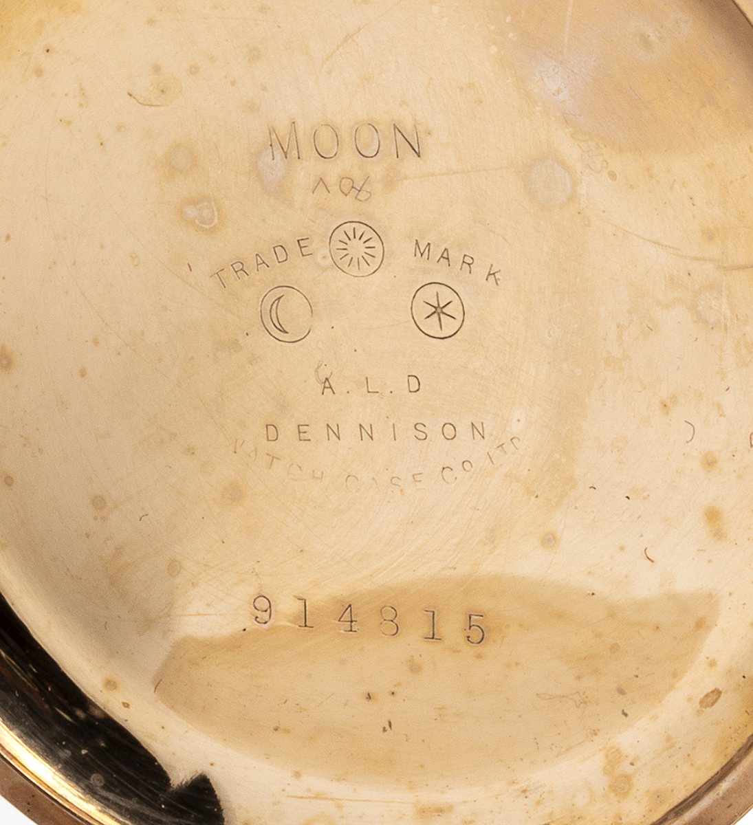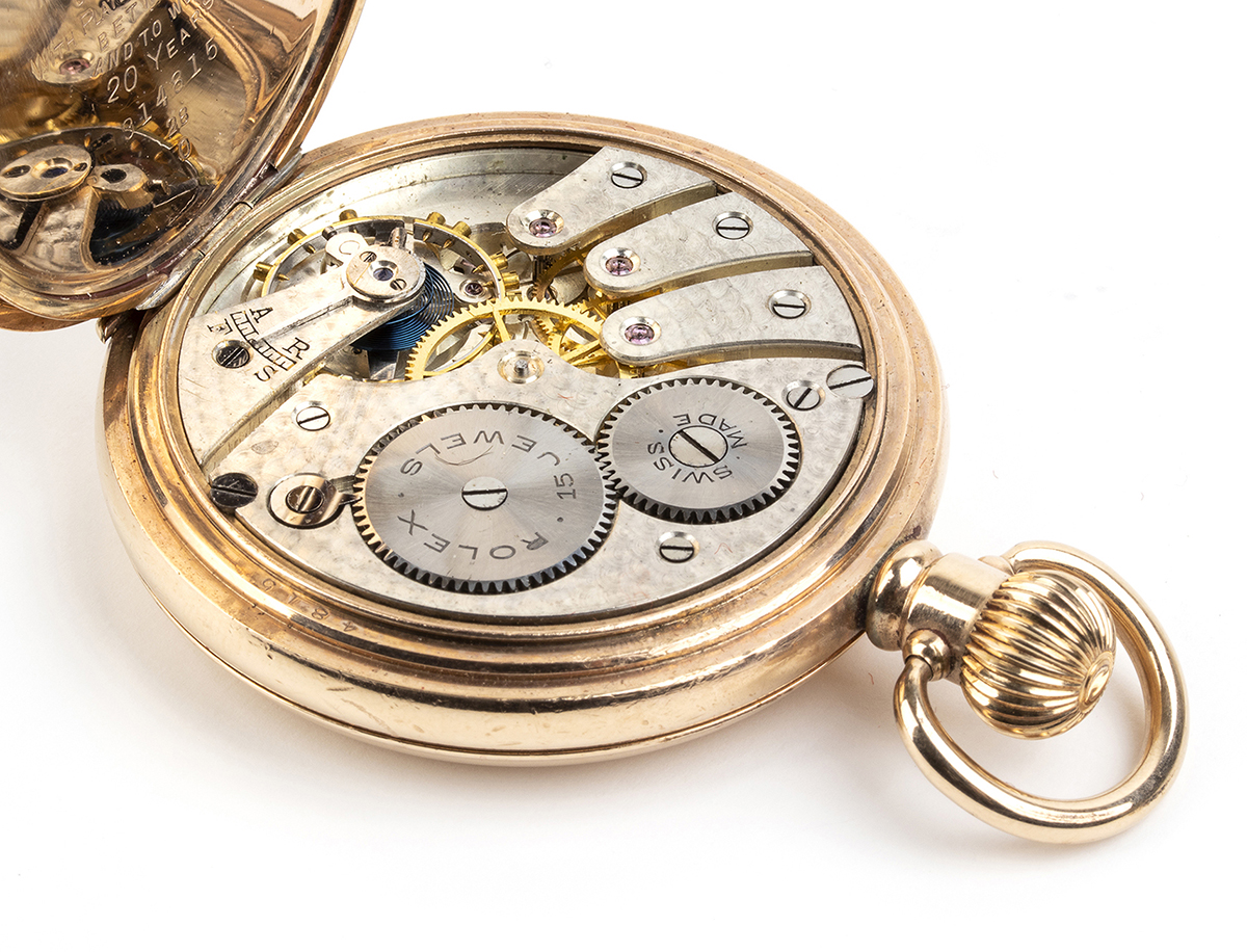cassa dorata savonette, quadrante in smalto bianco con numeri Arabi e sfere nere. Movimento con scappamento ad ancora e carica a remontoir firmato "Rolex". Cassa nr. 914815 firmata "A.L.D Dennison watchmaker Co. ltd". Diametro 49 mm.