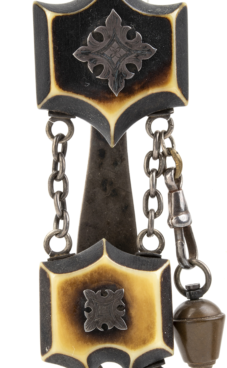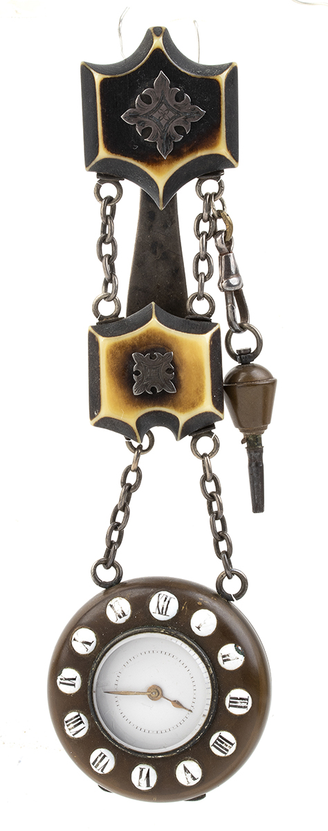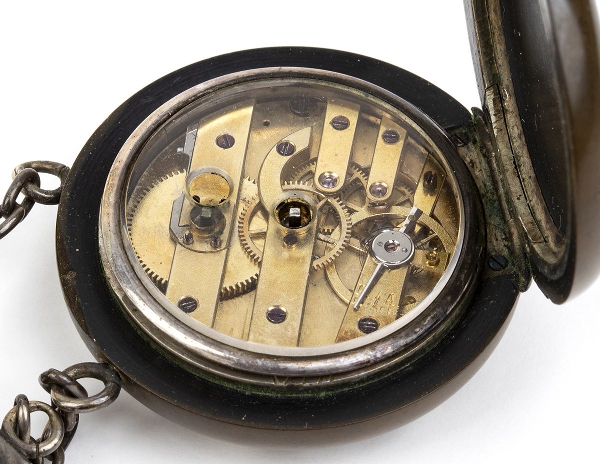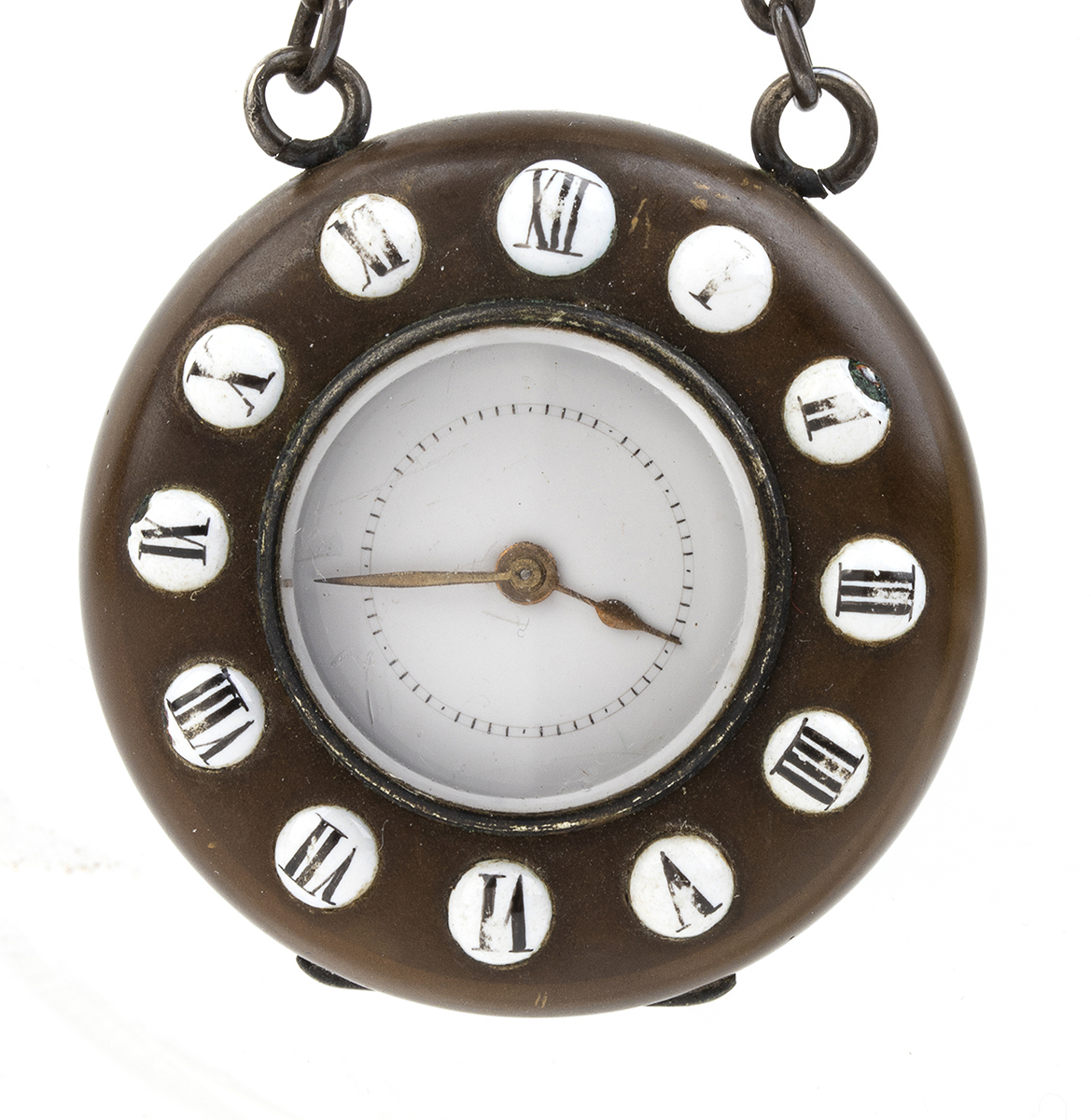 cassa in bachelire con numeri Romani posti perimetrelmente. Movimento con scappamento a cilindro. Diametro 40 mm, lunghezza catena 13,5 cm. Stato di conservazione: *** discreto. Non funzionante, da revisionare.