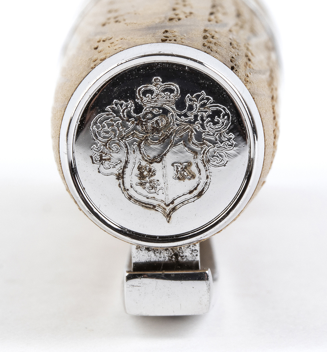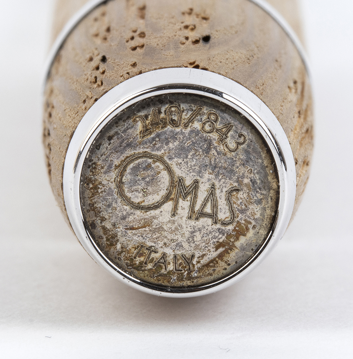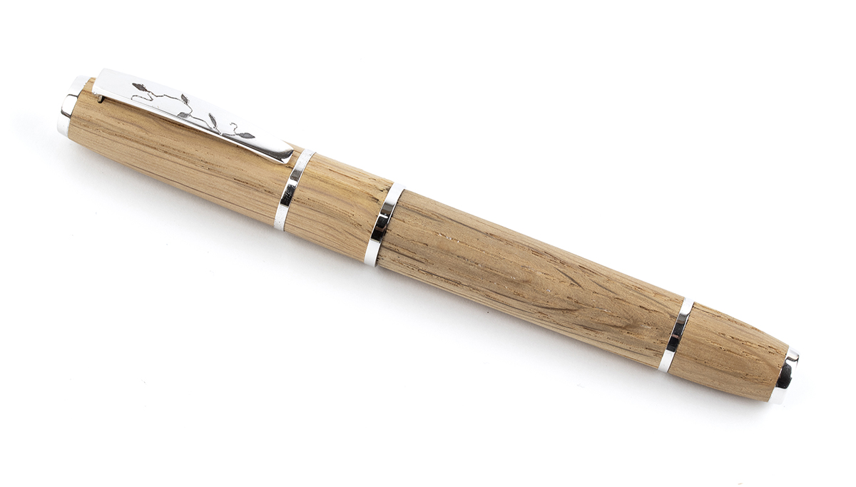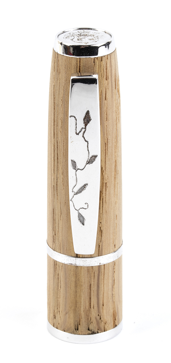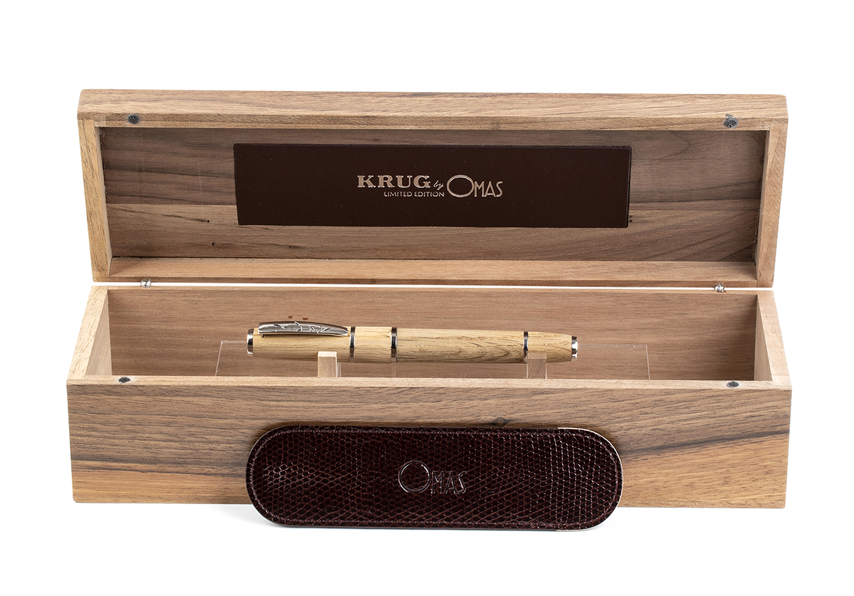 fusto e cappuccio in rovere invecchiato proveniente da botti di krug utilizzate per la prima fermentazione di tutti i loro Campagne dal 1969 al 2002, questa grande ed elegante penna è evidenziata da cinque anelli in argento 925/1000, due in alto e in basso e tre al centro e una clip incisa con un motivo di foglie di vite. Sistema di caricamento a stantuffo e pennino fine in oro 18k. Edizione limitata 240/843.