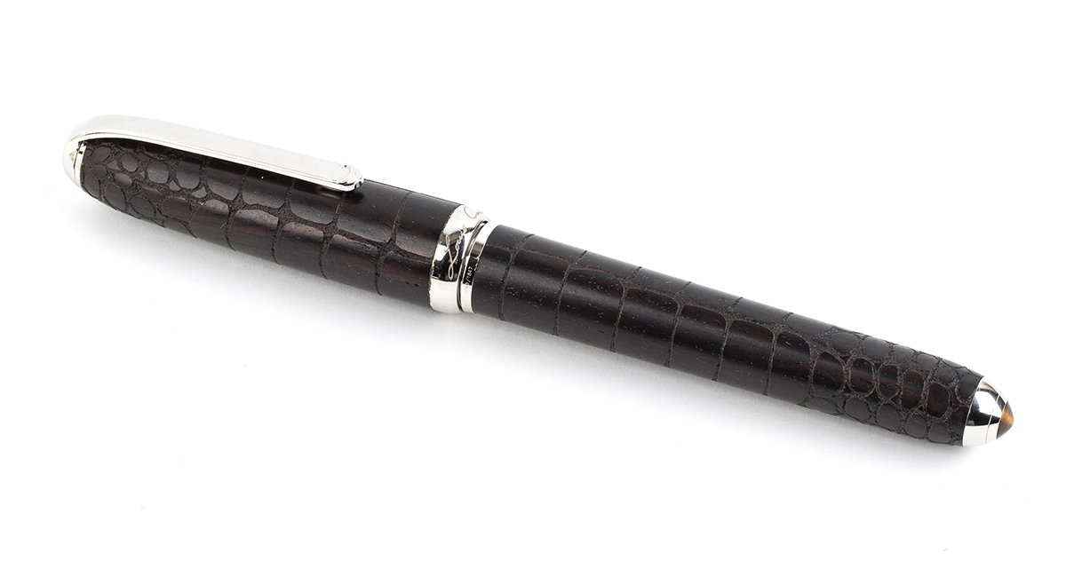 fusto e cappuccio a scaglie di coccodrillo incise su ebano, pennino in oro 18k riportante la dicitura "18k-750 e logo Cartier". Modello ST170108. Sistema di caricamento a cartuccia o con convertitore.