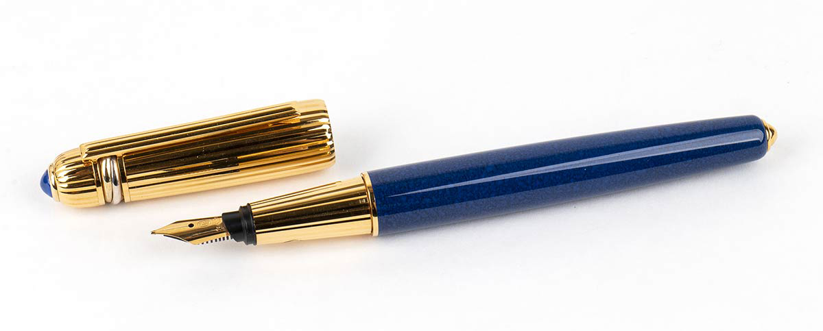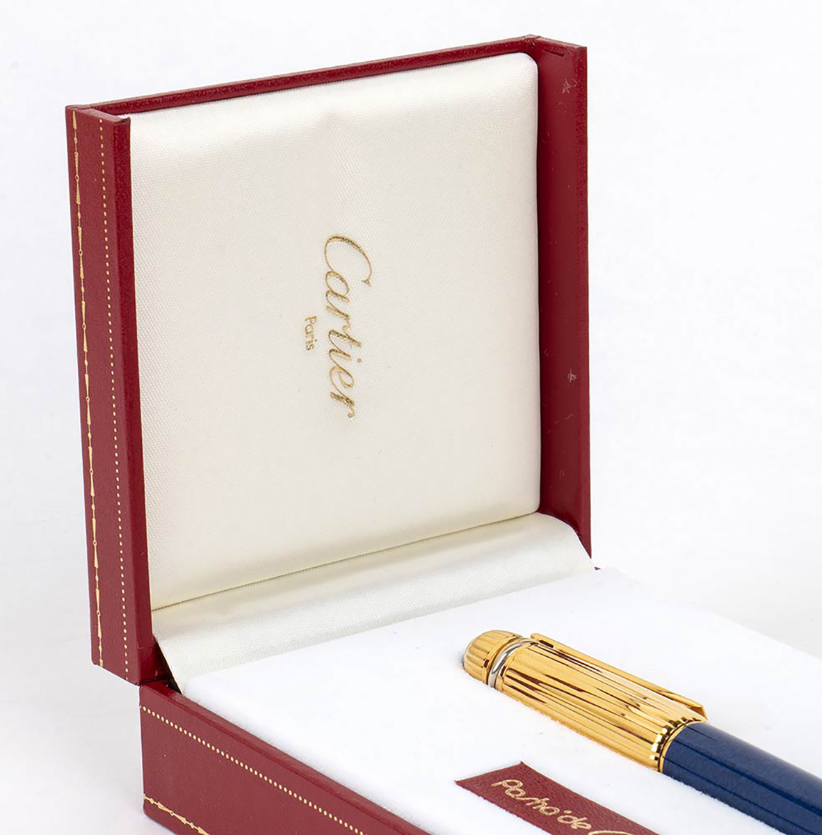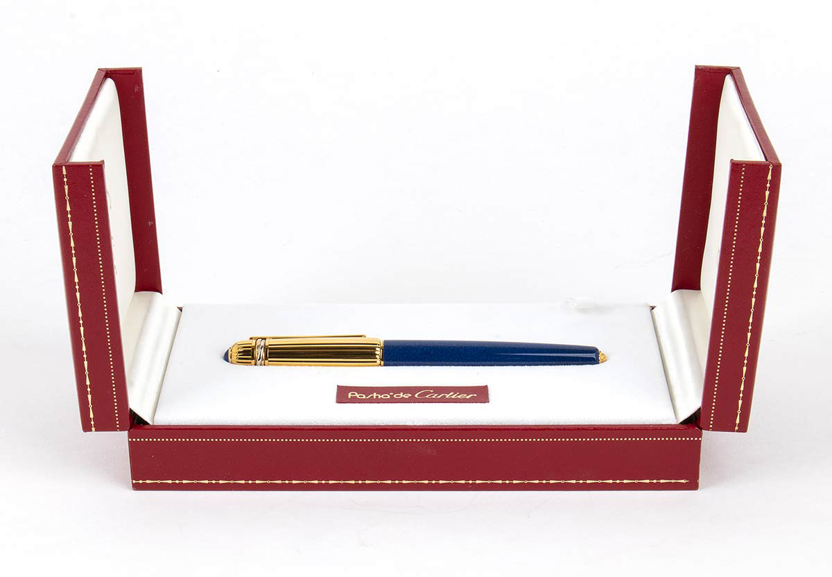 metallo dorato e lacca blu con cappuccio godronato, pennino in oro 18k riportante la dicitura "18K 750" e logo Cartier. In perfette condizioni. Cappuccio firmato "Pasha de Cartier".