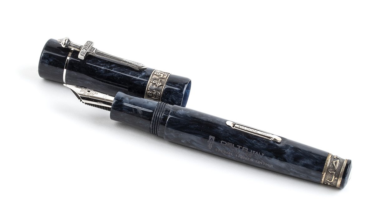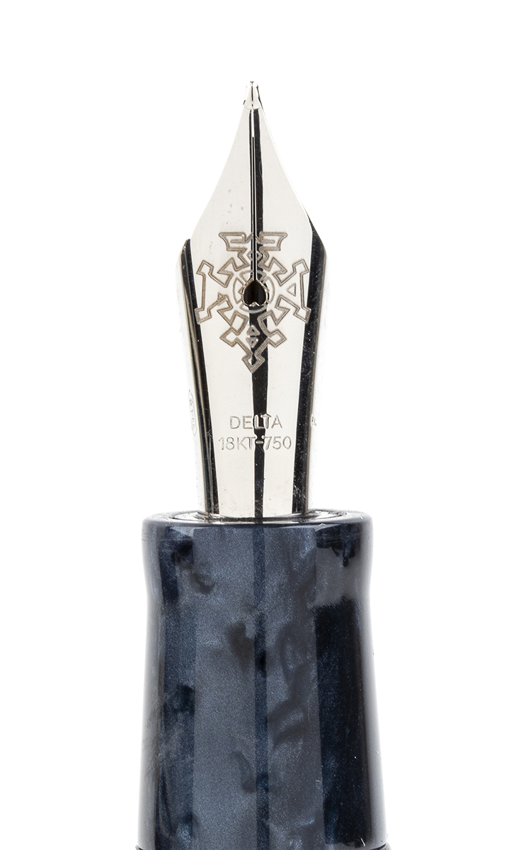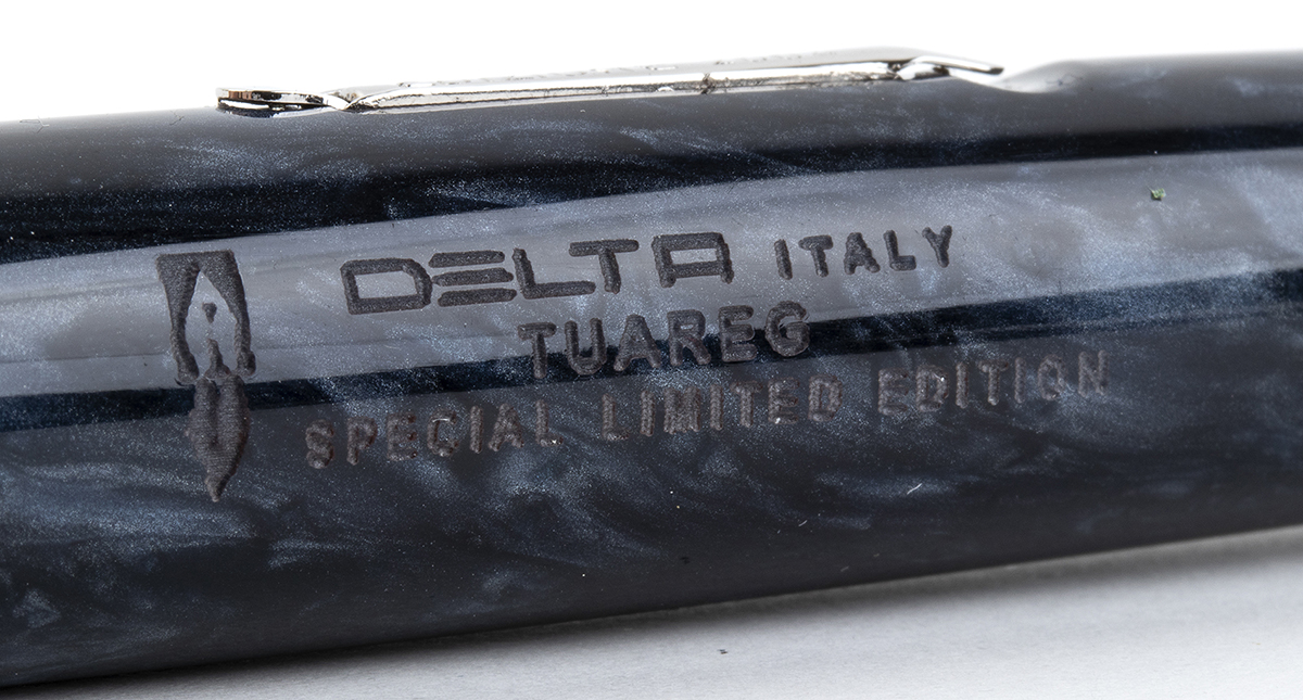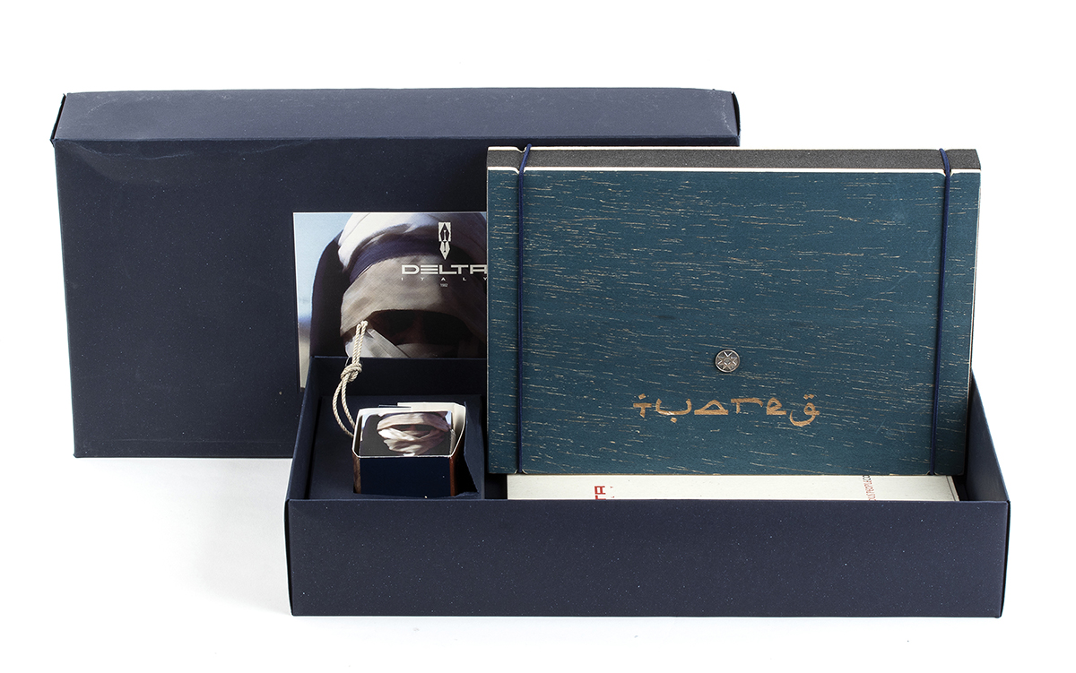 fusto, cappuccio in resina madreperlata di colore blu tornita a mano da barra piena, riportanti la scritta "DELTA ITALY TUAREG SPECIAL LIMITED EDITION". Sistema di caricamento d'inchiostro a leva laterale, pennino in oro 18k riportante la dicitura "DELTA 18Kt-750 M, 1 CE". Edizione limitata 0562/1830.