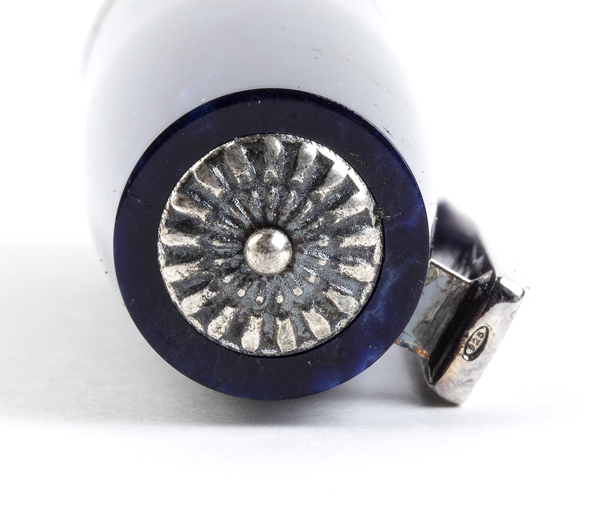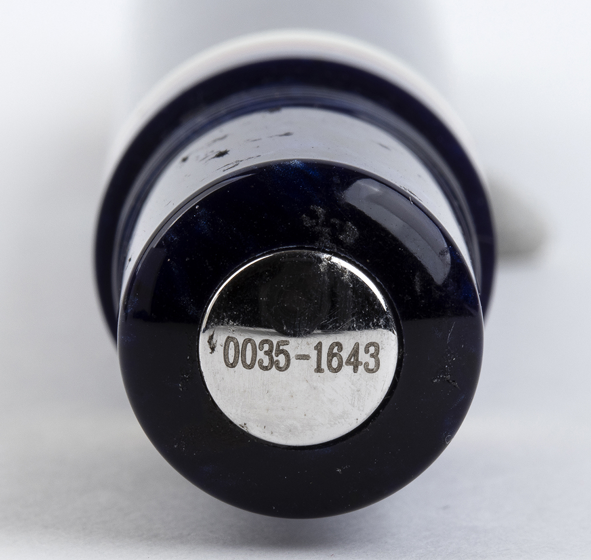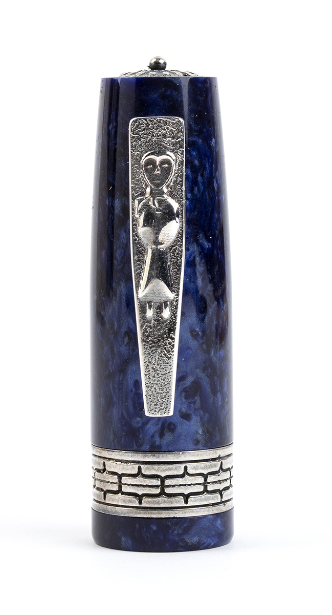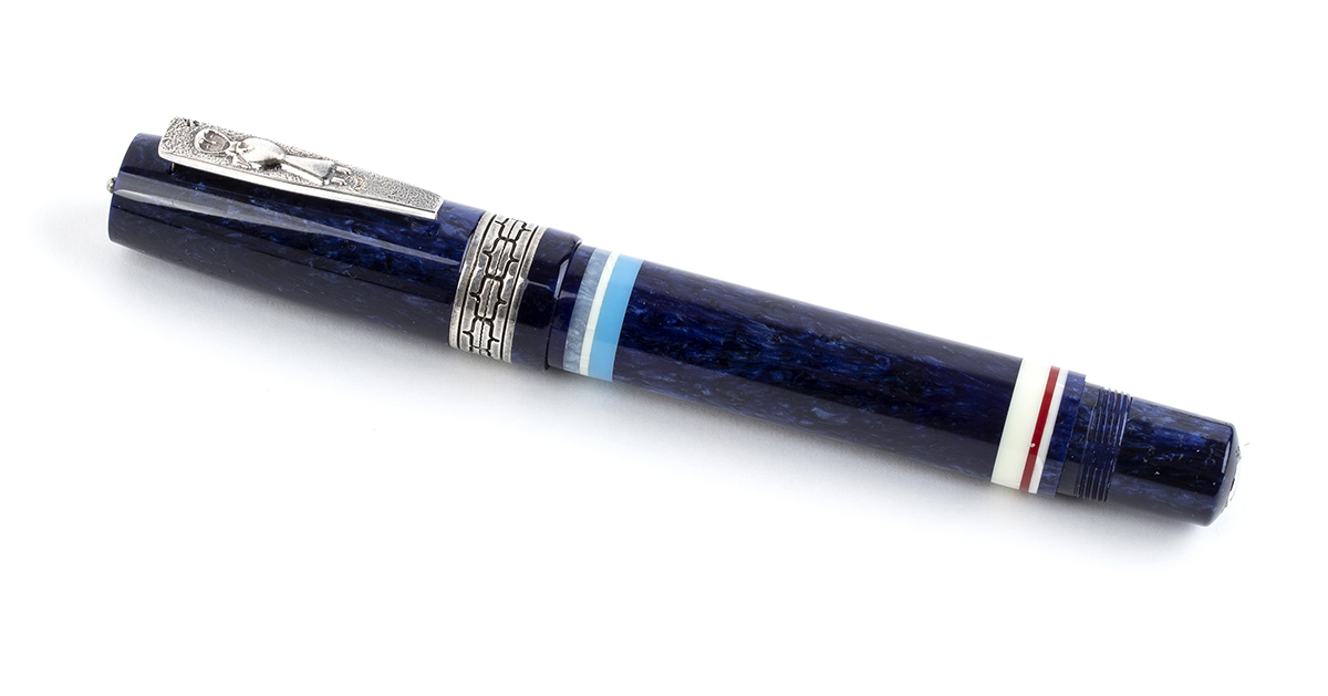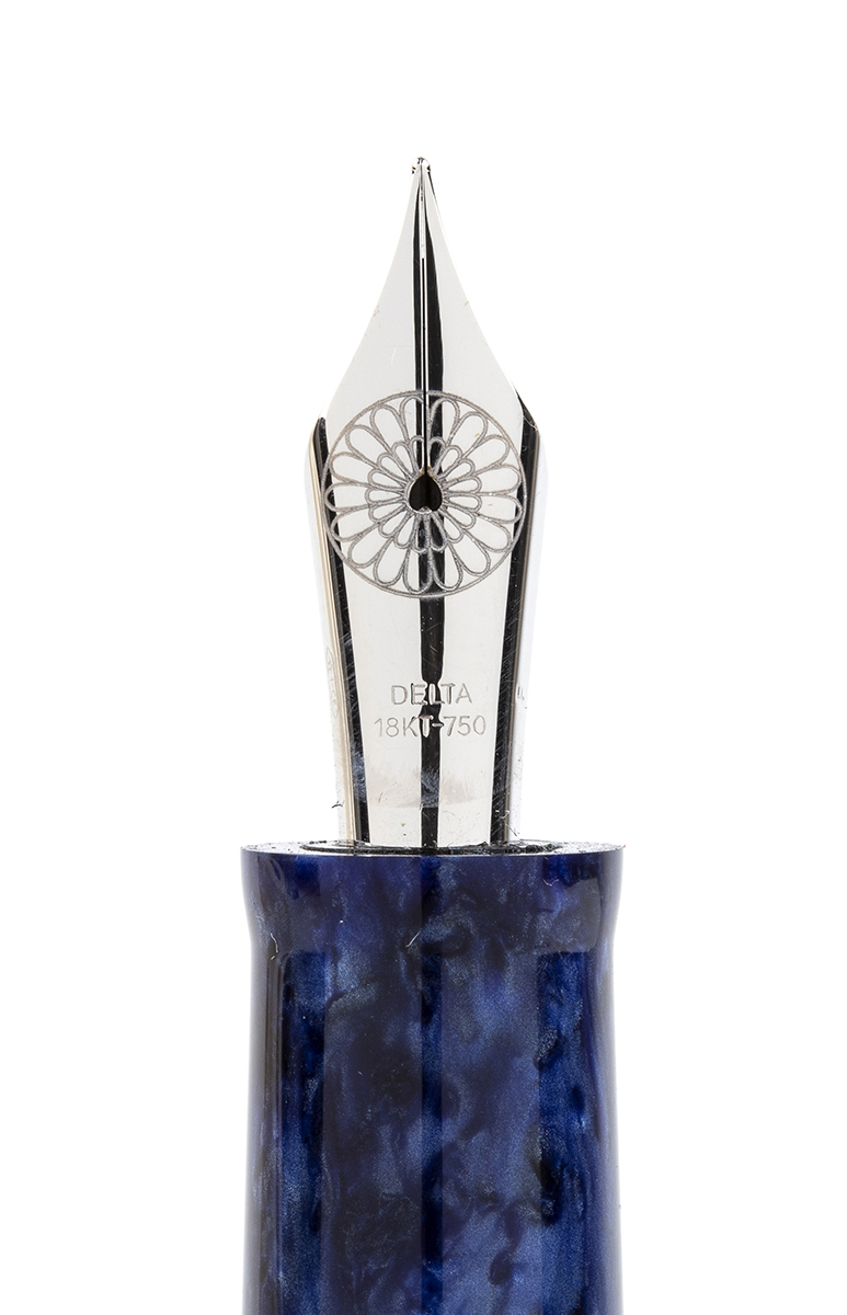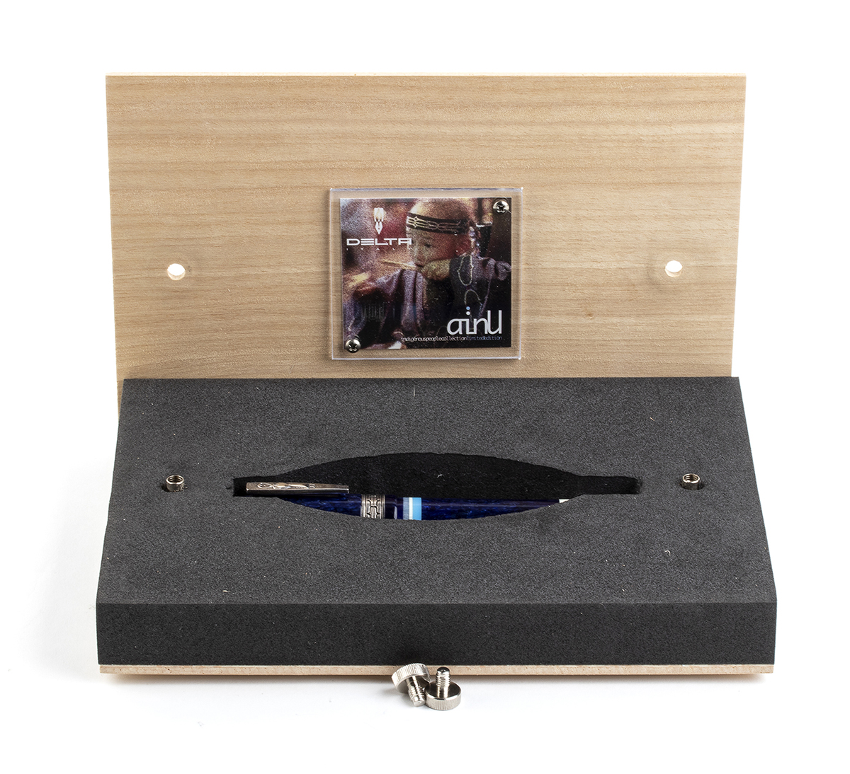 fusto, cappuccio in resina speciale di colore blu madeperlato, tornita a mano da barra piena, intervallata da anelli multicolore, riportanti la scritta "DELTA ITALY AINU LIMITED EDITION". Sistema di caricamento a cartuccia, pennino fine in oro 18k riportante la dicitura "DELTA 18Kt-750 M, 1 CE". Edizione limitata 35/1643.