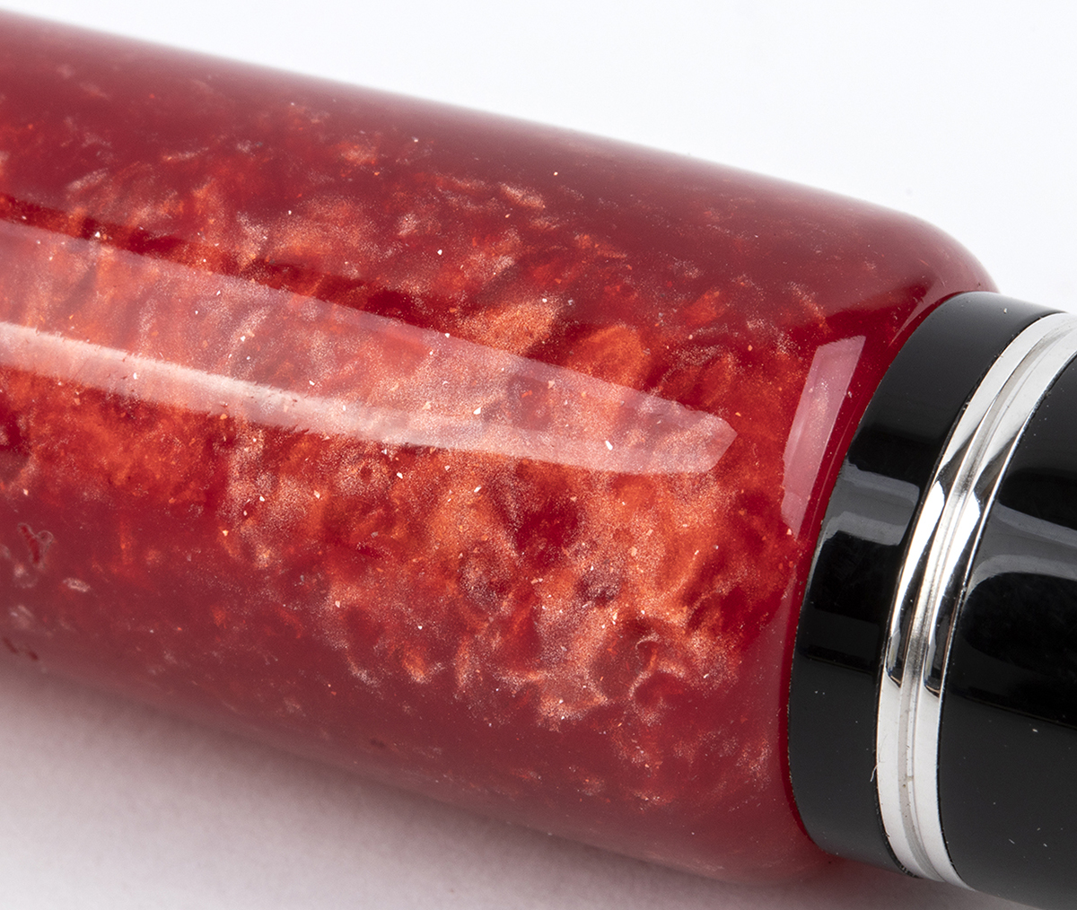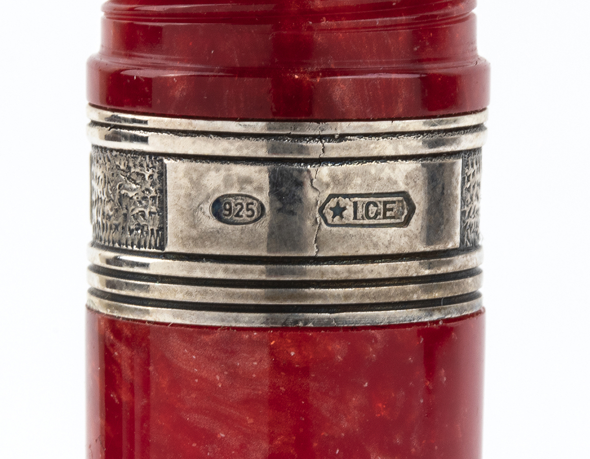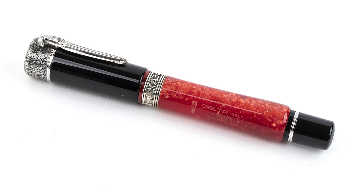 fusto, cappuccio in resina speciale di colore rosso con composizione di madeperla e glitter, tornita a mano da barra piena, riportanti la scritta "DELTA ITALY cossaks LIMITED EDITION". Sistema di caricamento a cartuccia, pennino fine in oro 18k riportante la dicitura "DELTA 18Kt-750 M, 1 CE". Edizione limitata 287/1569.