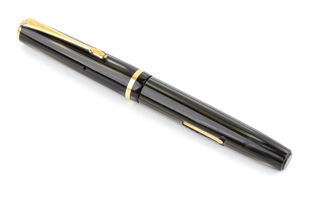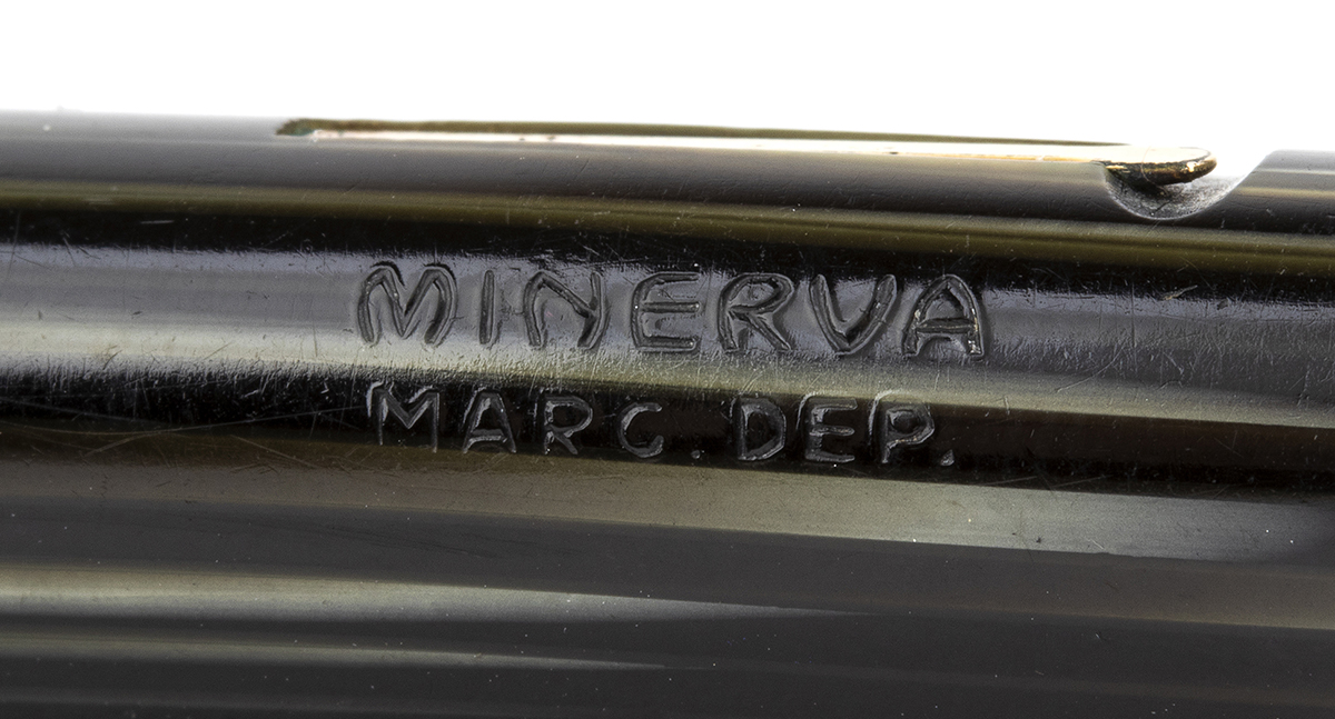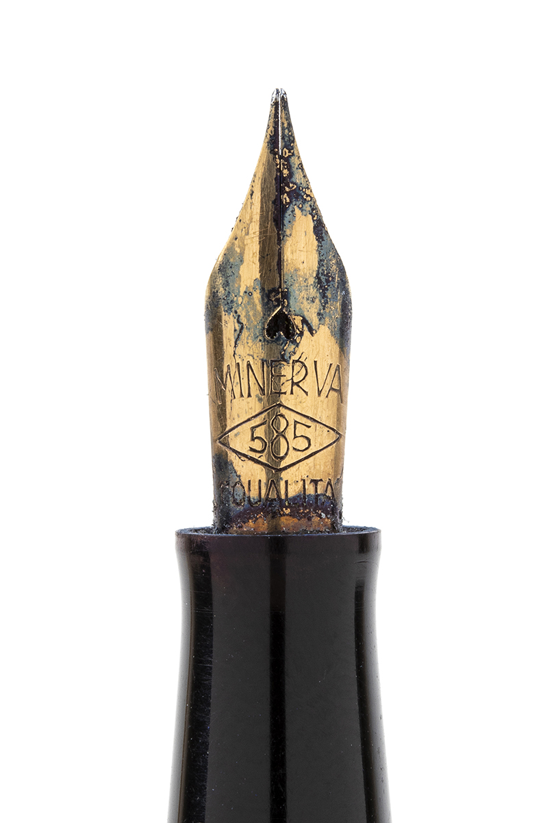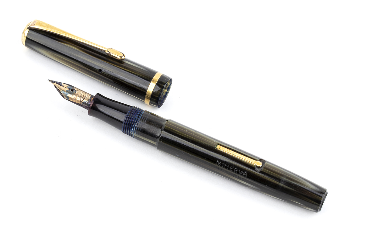 corpo e cappuccio in bachelite verde e nera. Sistema di caricamento con leva laterale. Pennino riportante la scritta "MINERVA 585 1 Qualità".