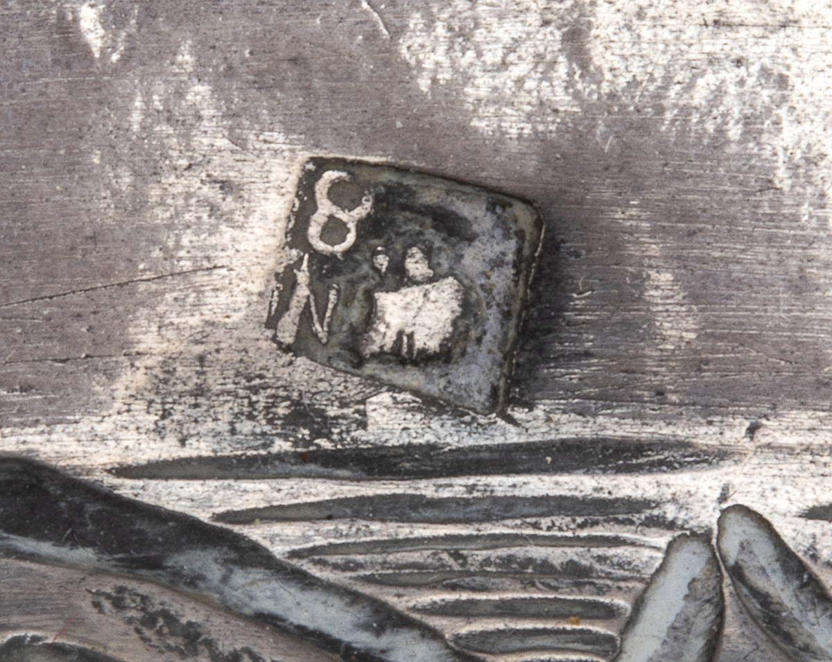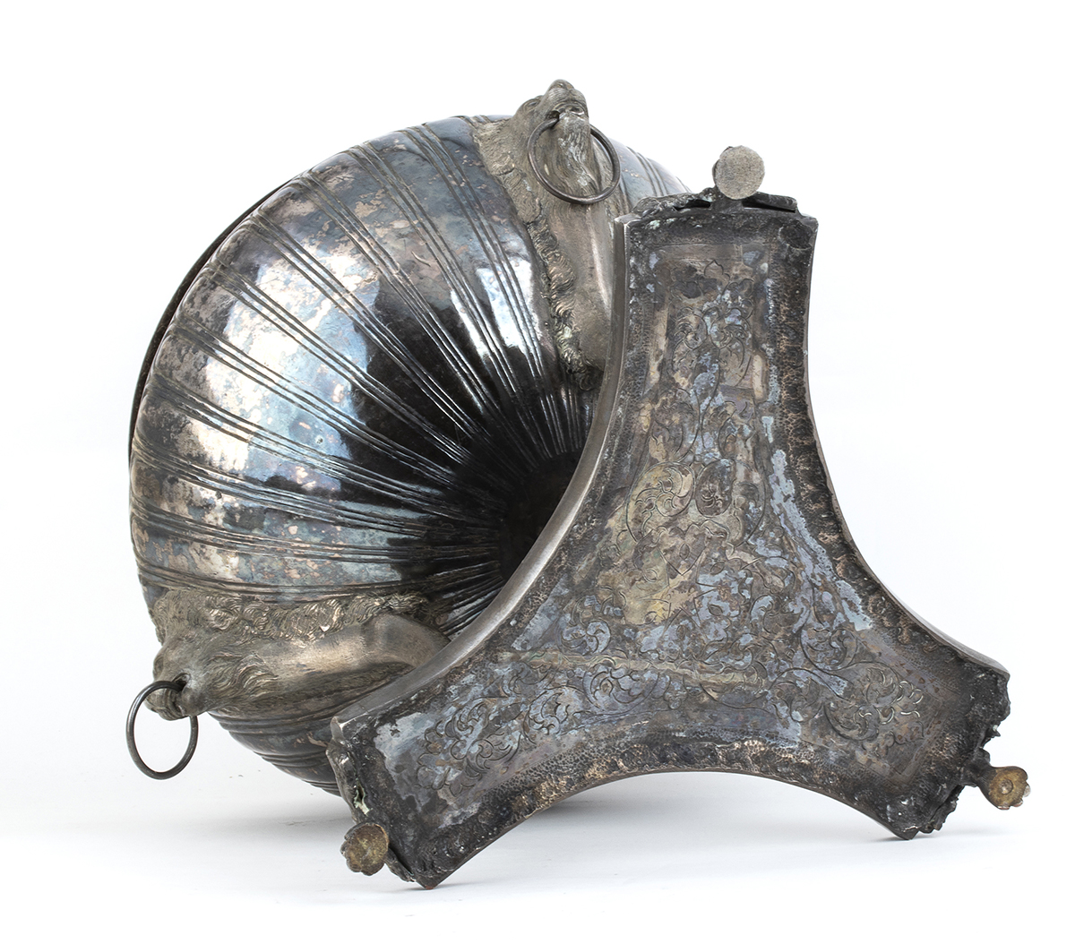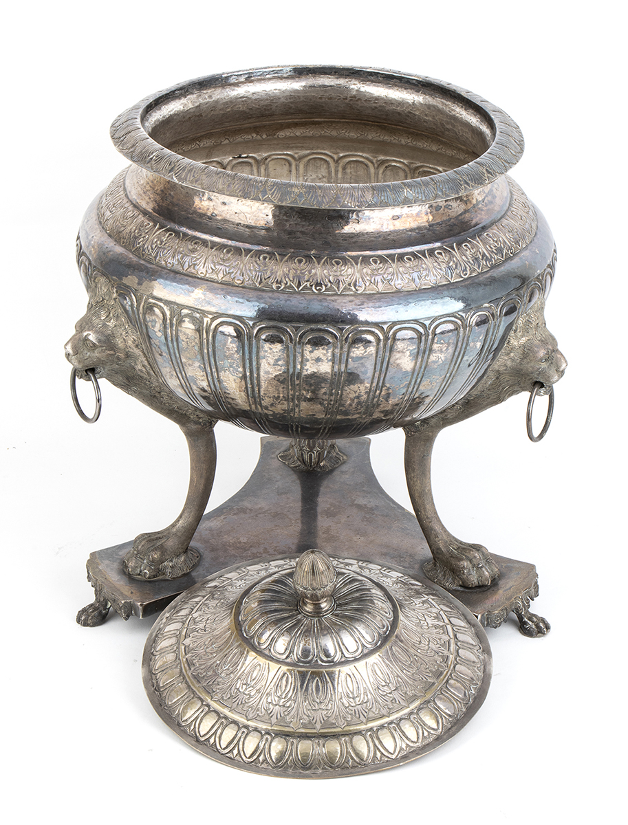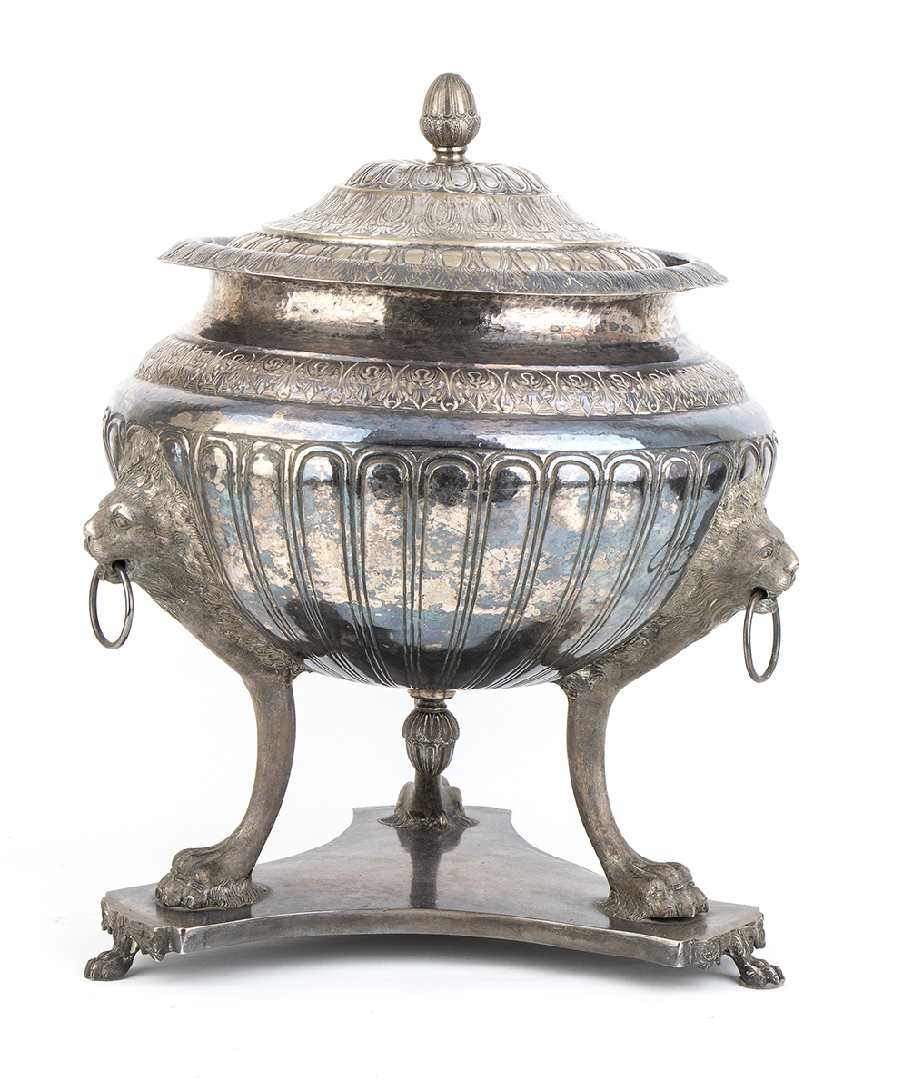 corpo circolare scanalato decorato con con tre teste leonine, poggiante su tre piedi ad artiglio su basamento a tripode. Coperchio duomato con fastigio a pigna. Argento 800/1000, punzonata con il marchio in uso alla corporazione degli orefici di Napoli per gli oggetti in argento al titolo di 833/1000 o 10 once, 1832-1872.