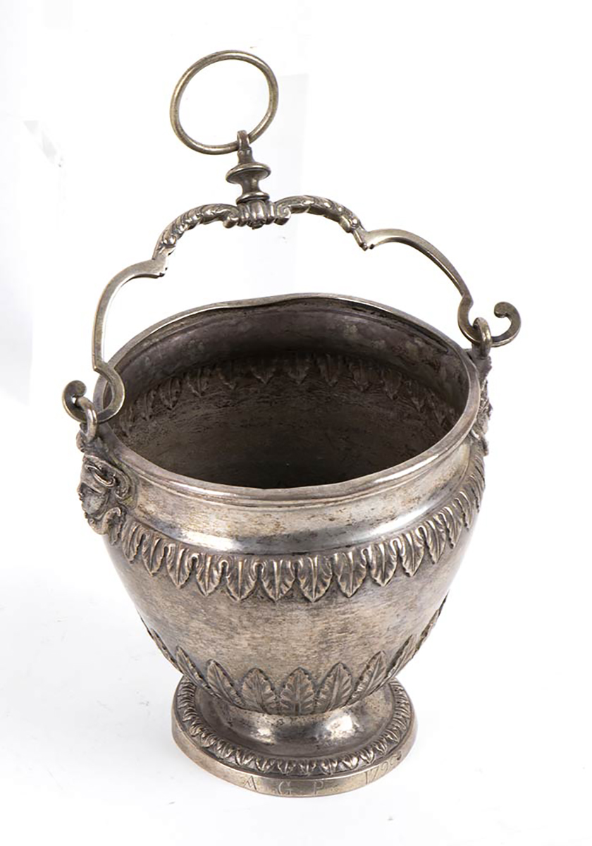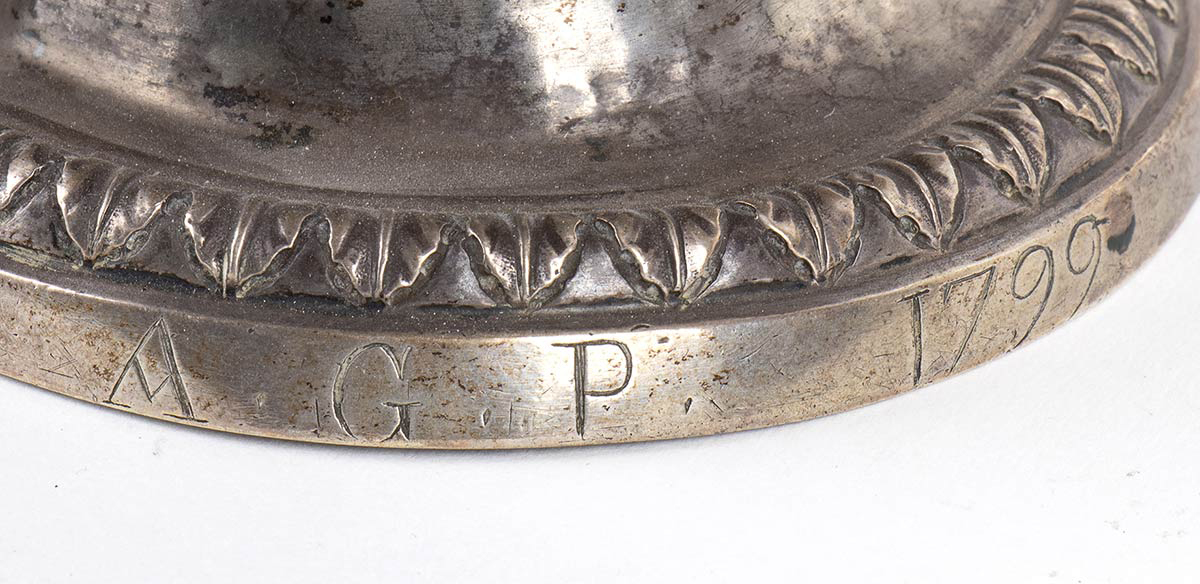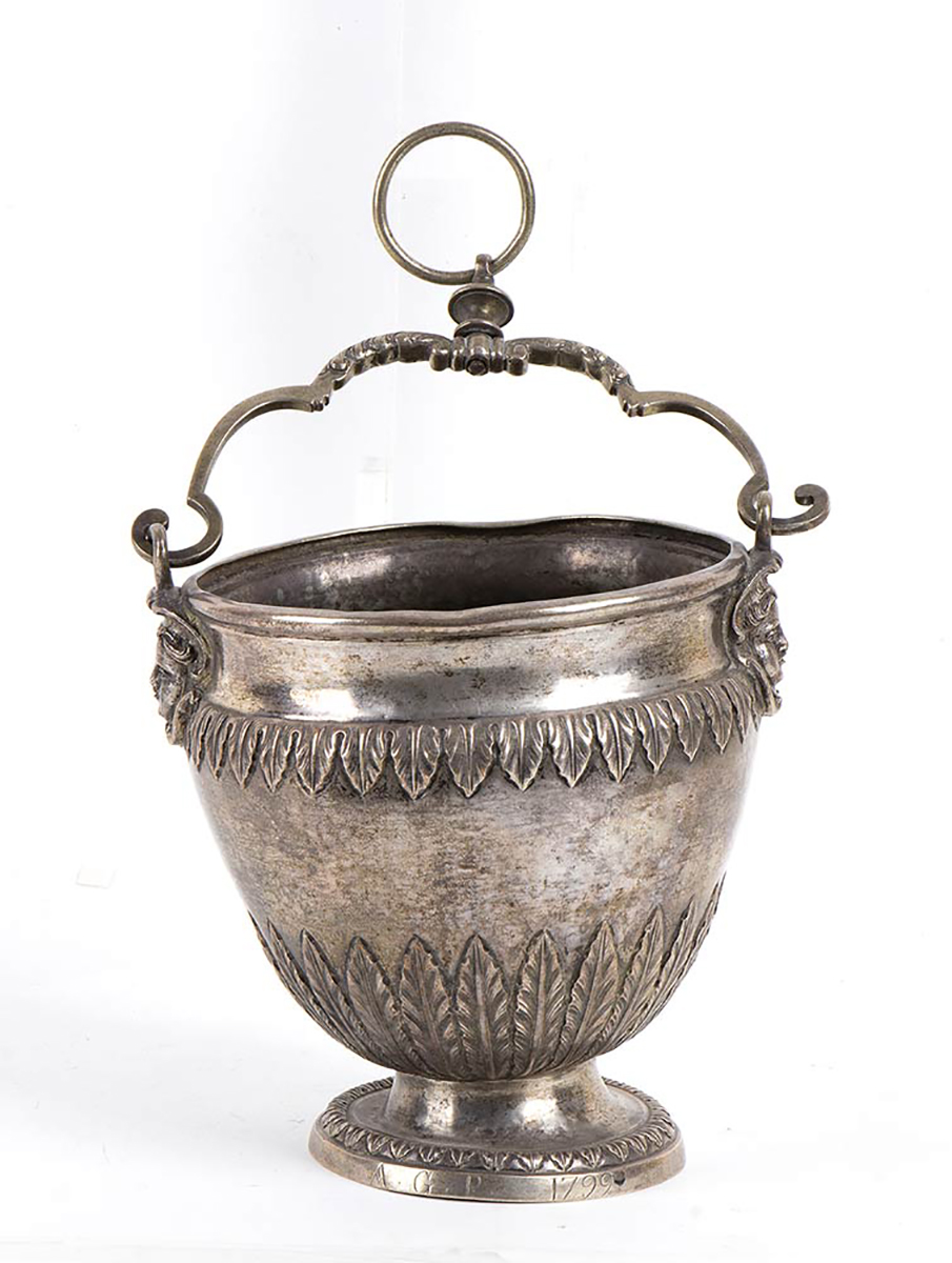 base circolare decorata con foglie, corpo con il fondo a ceppo fogliaceo terminante con fascia decorata a motivi fogliati. Manico a volute con anello superiore, unito al corpo da mascheroni. Punzonato con il marchio di un argentiere non identificato, probabilmente Napoli. Sul piede riporta l'iscrizione "A.G.P. 1799".