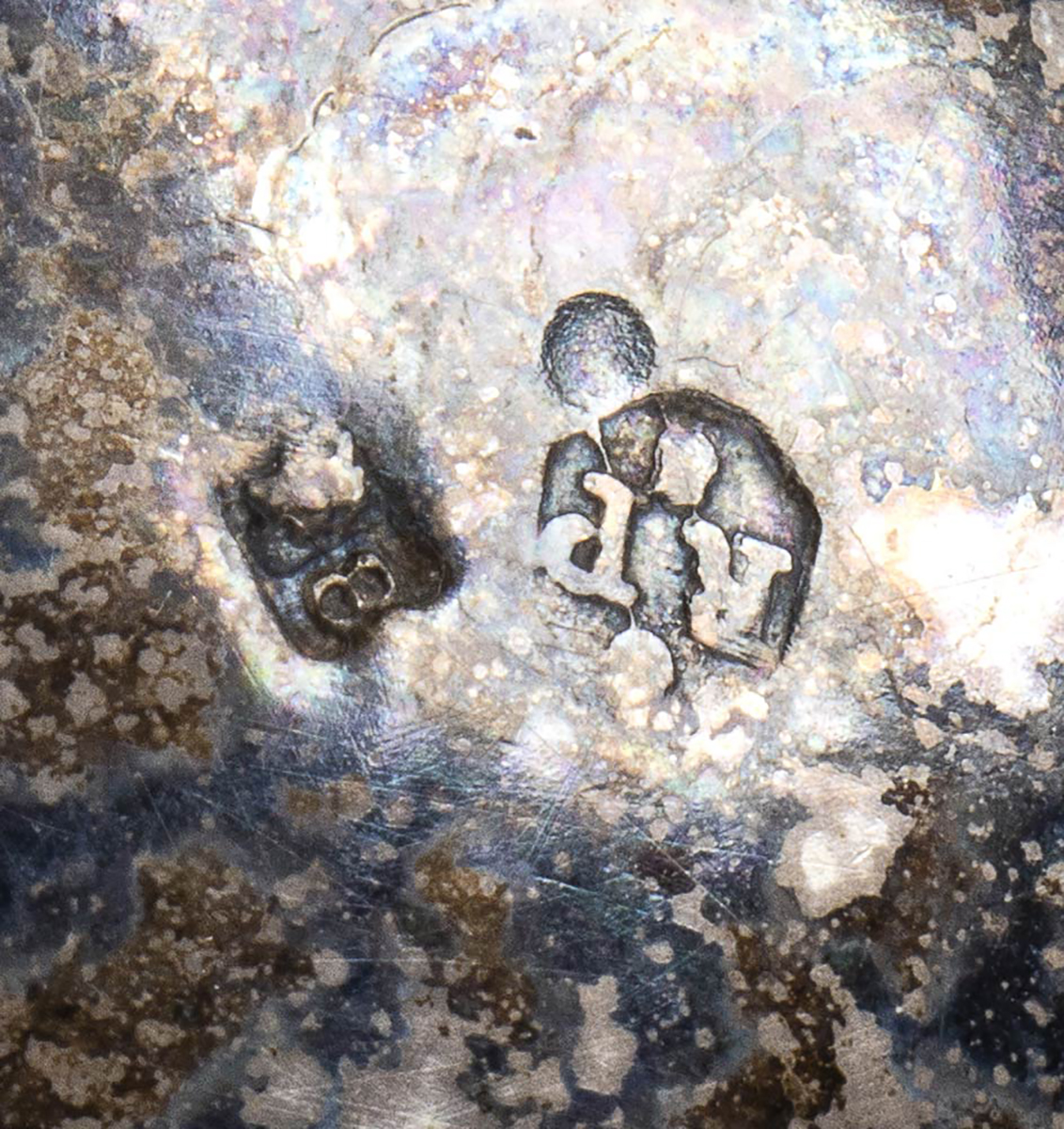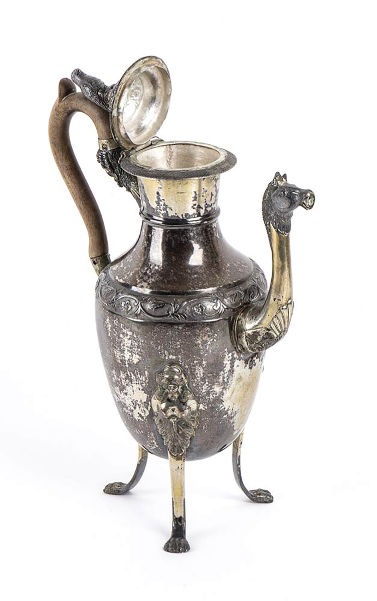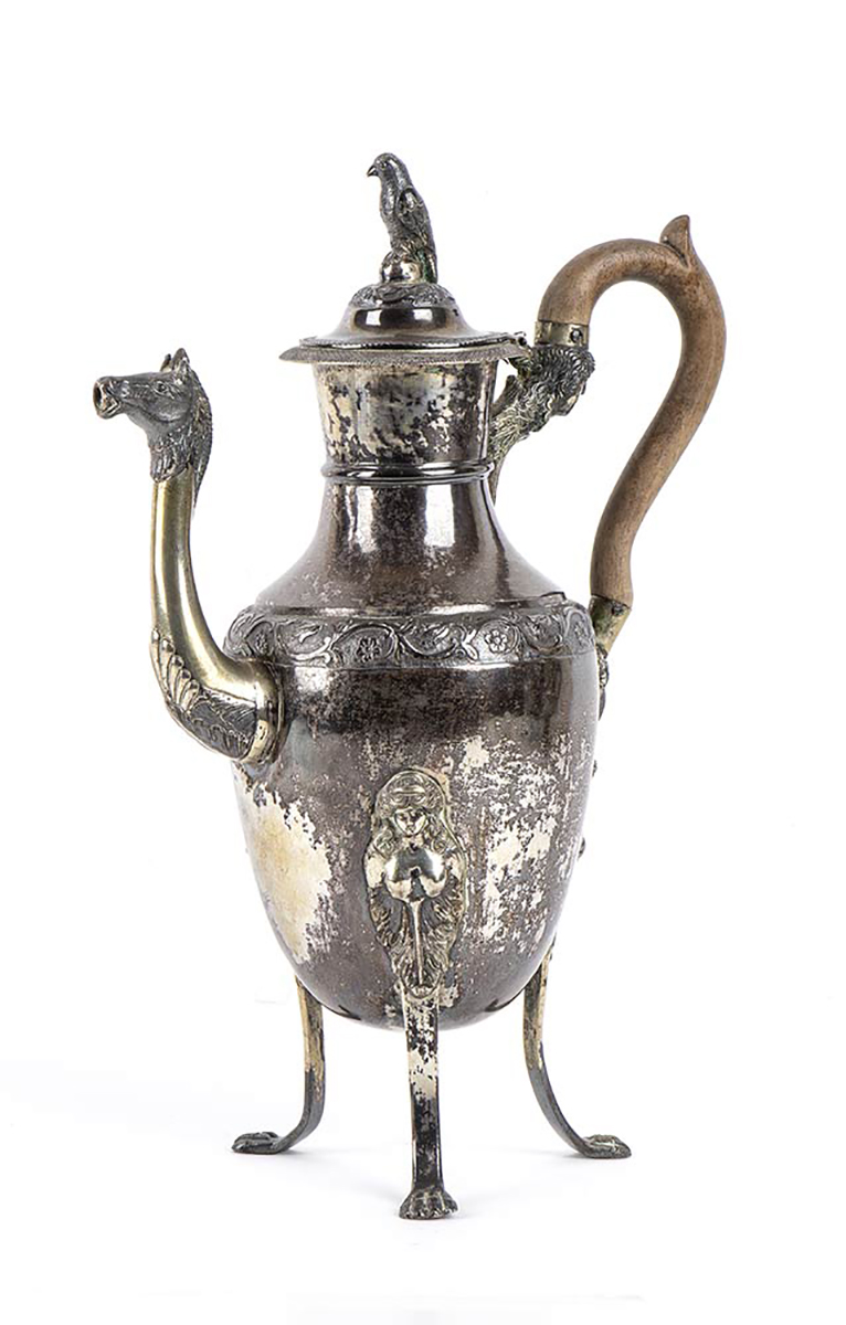 a tre piedini, corpo a uovo con versatoio a forma di testa equina, coperchio con cimasa a forma di rapace e manico in legno con attacco antropomorfo. Punzonata con il marchio in uso alla corporazione degli orefici di Napoli per l'argento al titolo di 833/1000, 1824-1832, argentiere Raffaele Parascandolo (Rif. Elio e Corrado Catello, argenti napoletani pag. 146).