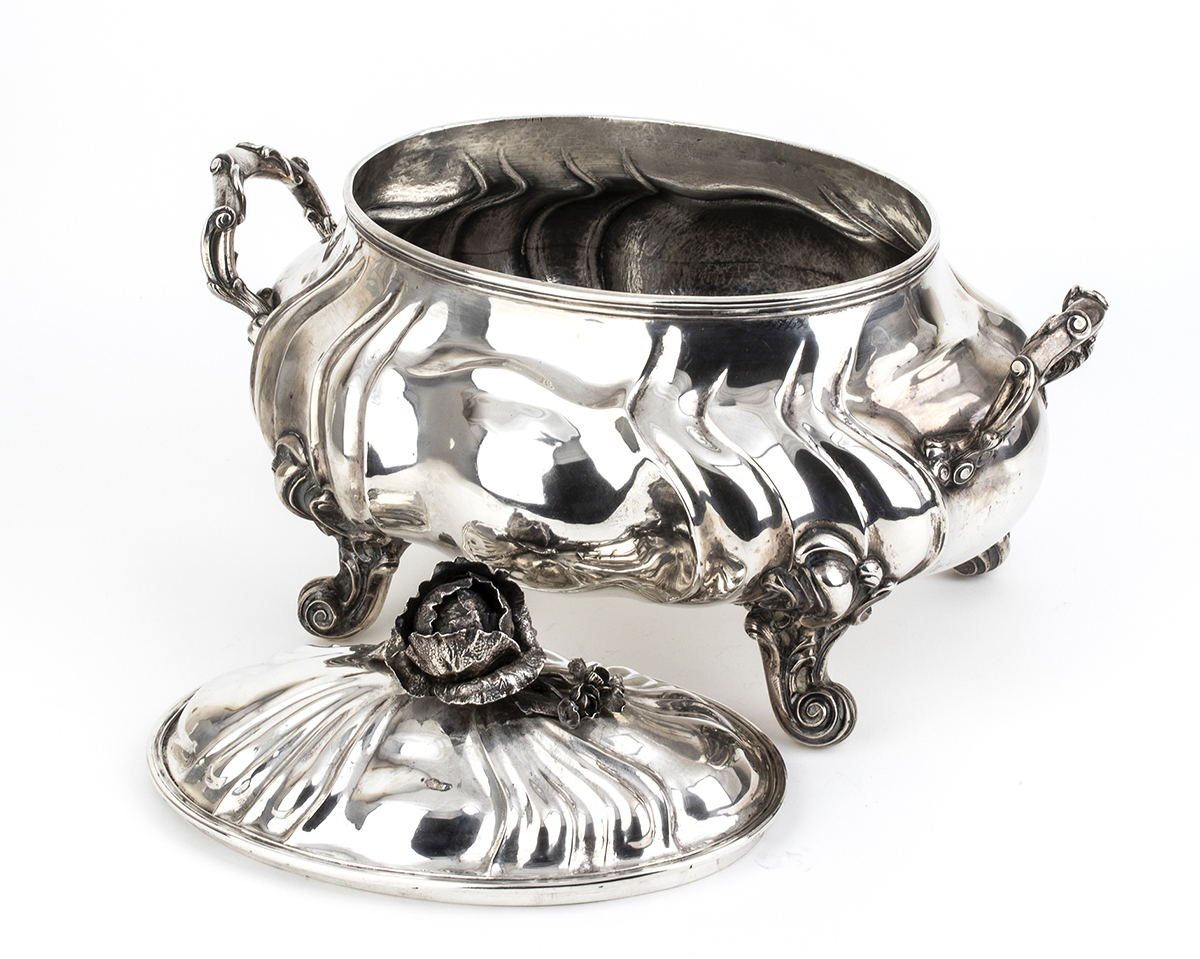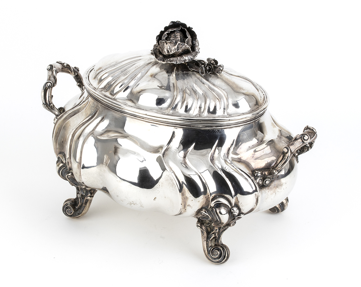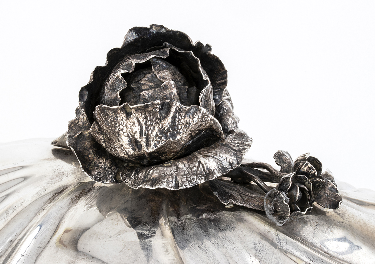 corpo bombato e centinato poggiante su quattro piedini a riccio, a due manici laterali, coperchio con presa naturalistica. Argento 800/1000, punzonato Regno Lombardo Veneto, marchi in uso dal 1812 al 1872, numerose prese di saggio, argentiere e territoriale non rintracciati.