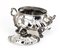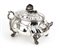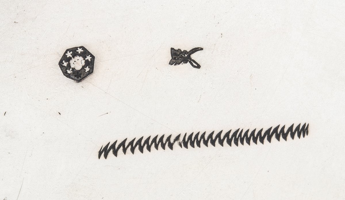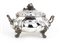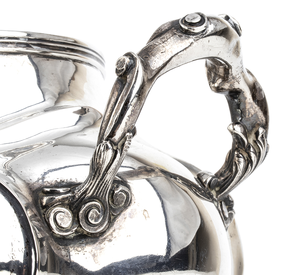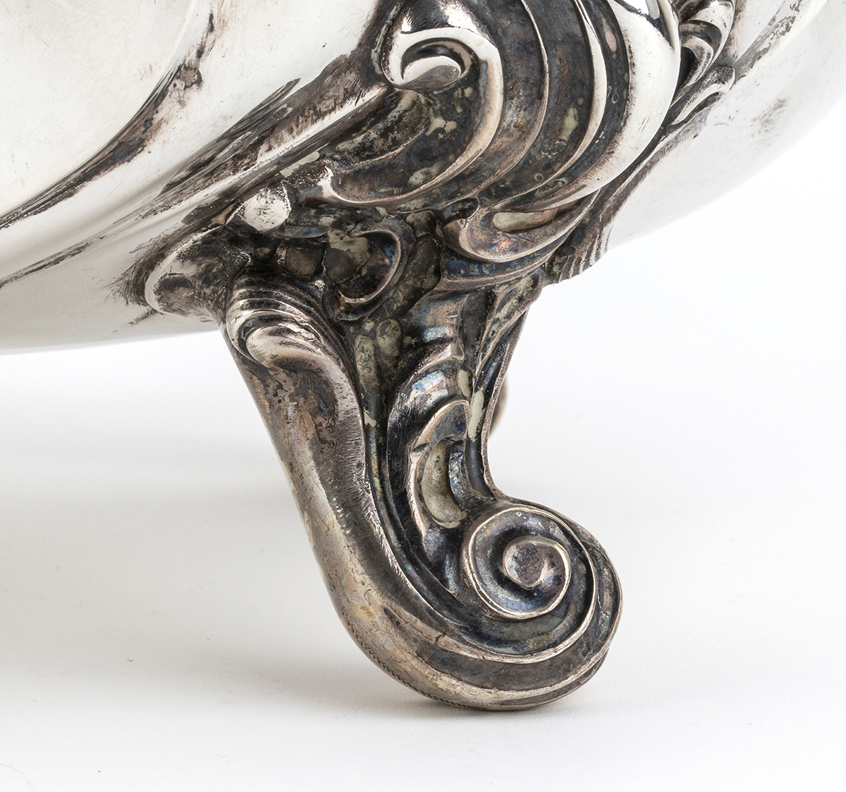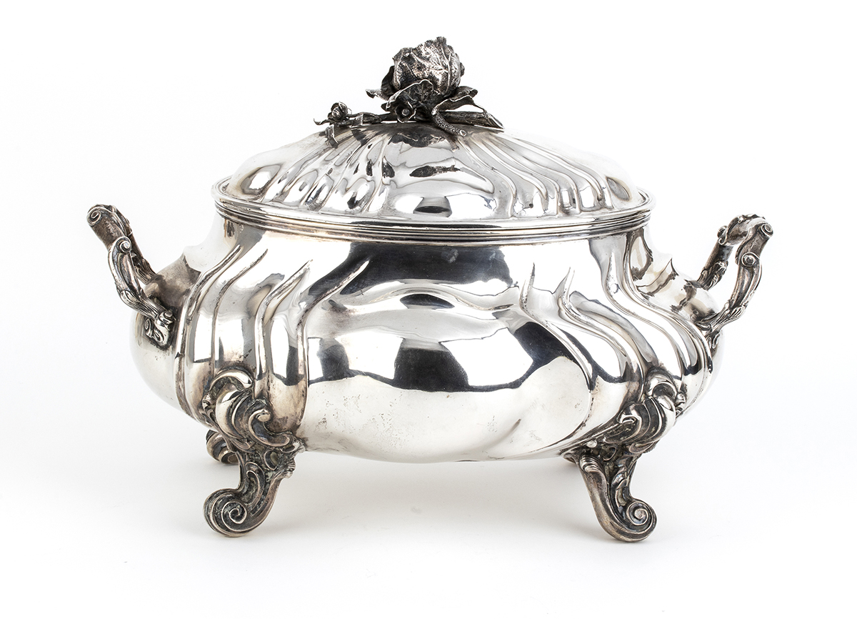corpo bombato e centinato poggiante su quattro piedini a riccio, a due manici laterali, coperchio con presa naturalistica. Argento 800/1000, punzonato Regno Lombardo Veneto, marchi in uso dal 1812 al 1872, numerose prese di saggio, argentiere e territoriale non rintracciati.