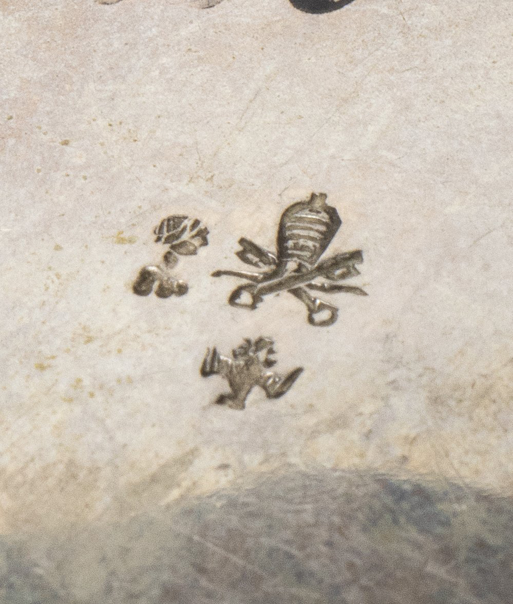di forma circolare con presa laterale. L'avvolgicera centrale sostiene i resti di una bobina di cera. Punzonata con marchi non identificati.