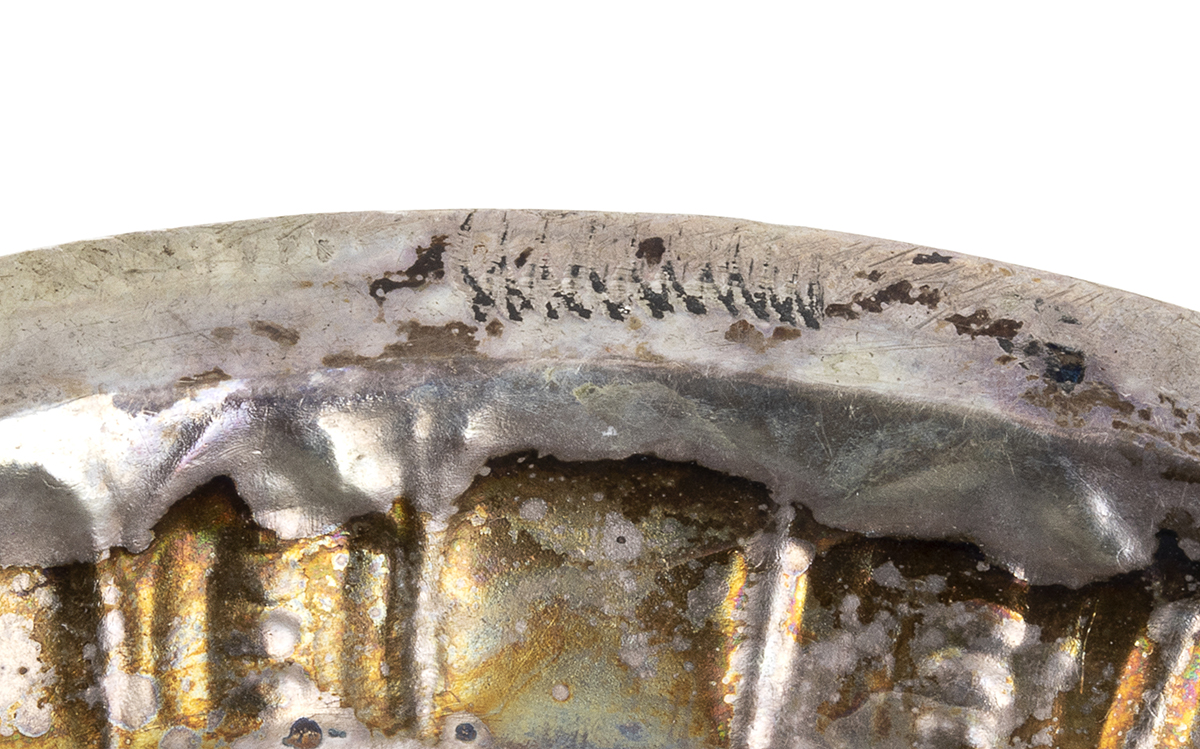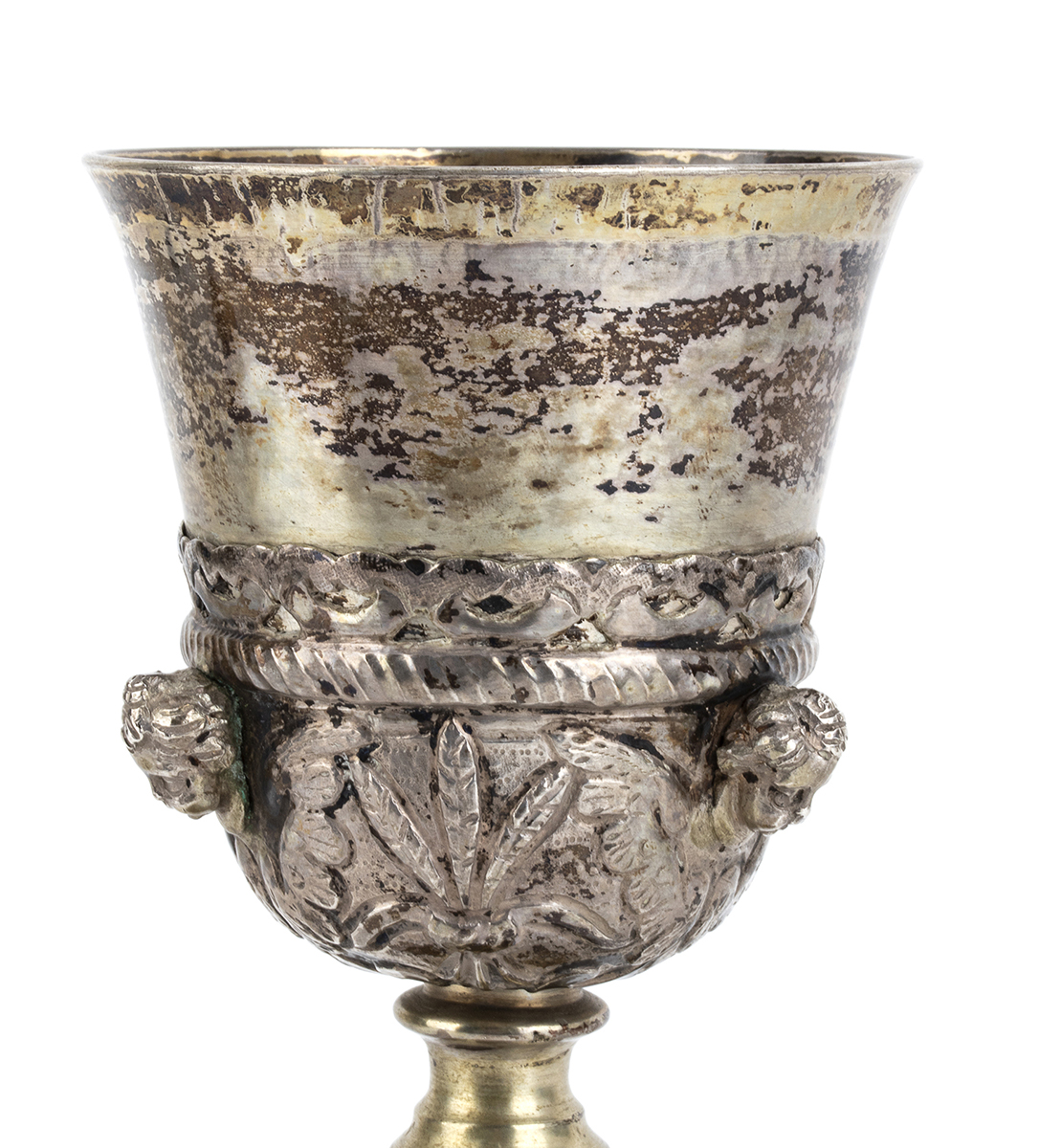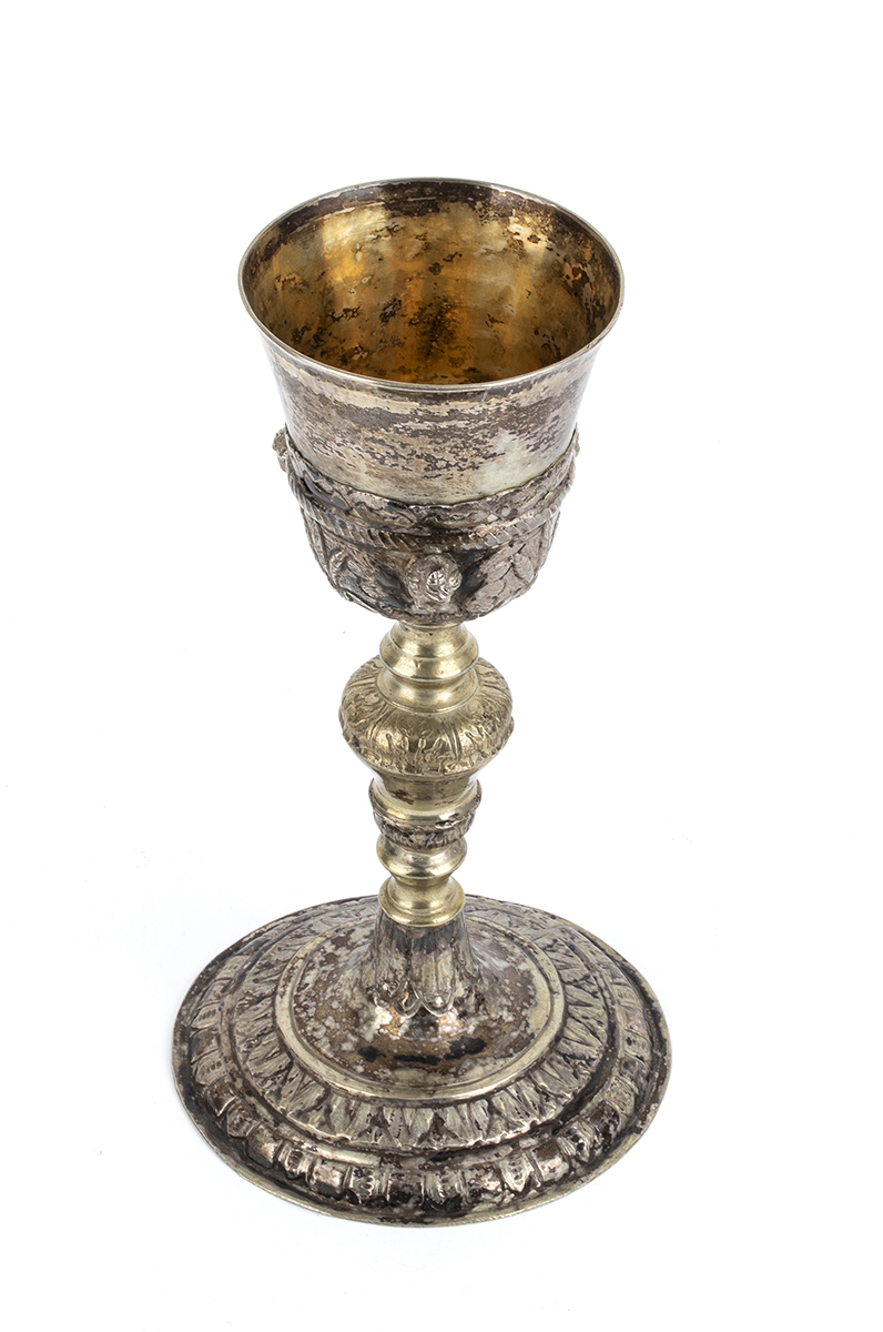 a base circolare gradinata, fusto a balaustro liscio e coppa dorata internamente. Non punzonato, nella parte inferiore è presente una antica presa di saggio .