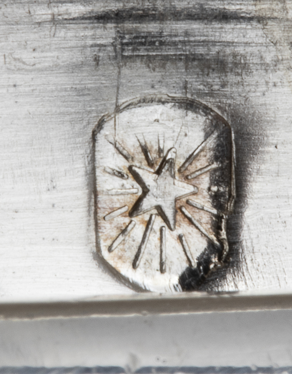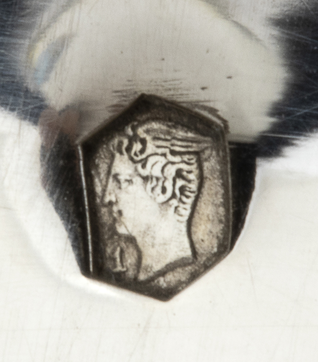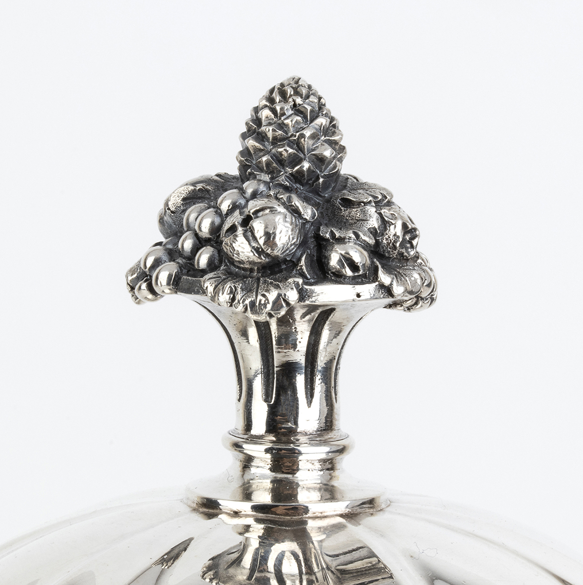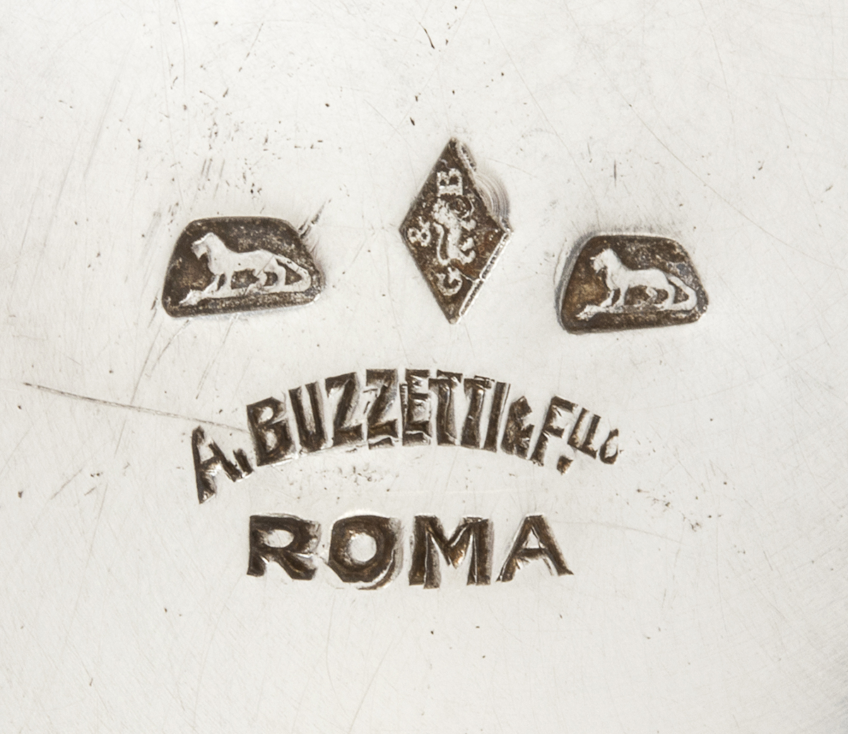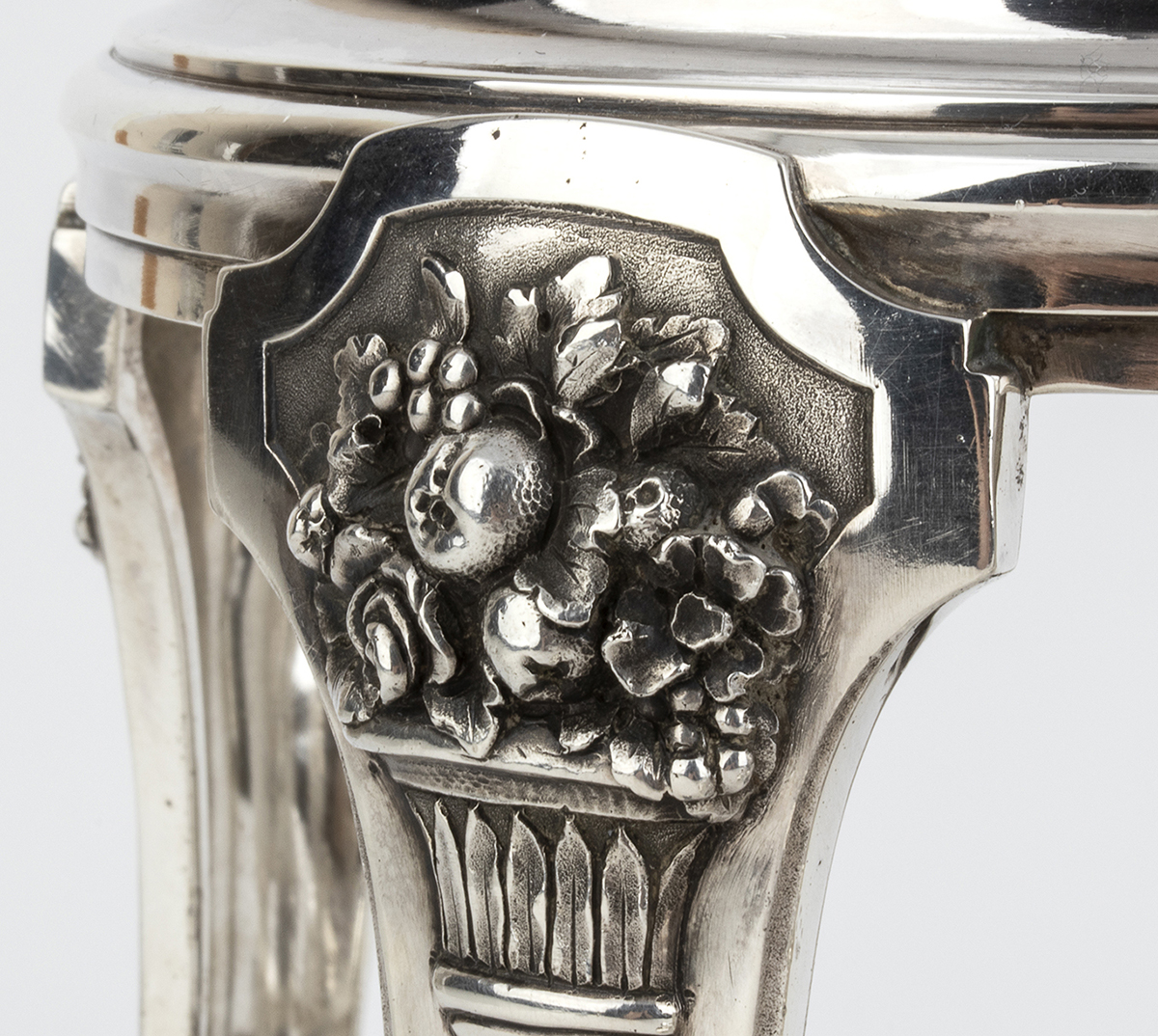 corpo e coperchio con scanalature verticali, e prese laterali e versatoio con rbginetto frontale, poggiante su quattro piedi a volute fogliate. Argento 950/1000, punzonato con il marchio di esportazione francese in uso dal 1879, con il marchio degli argentieri francesi "A. Gombert & P. Bibollet" operanti a Parigi (1913/1924), con il marchio degli argentieri di Milano "F.lli Leone", con il marchio del rivenditore romano "A. Buzzetti e Figlio" e con marchio speciale italiano di recensione per articoli in magazzino in uso nel 1934-1935.