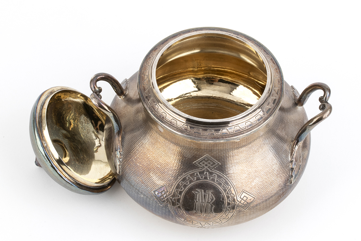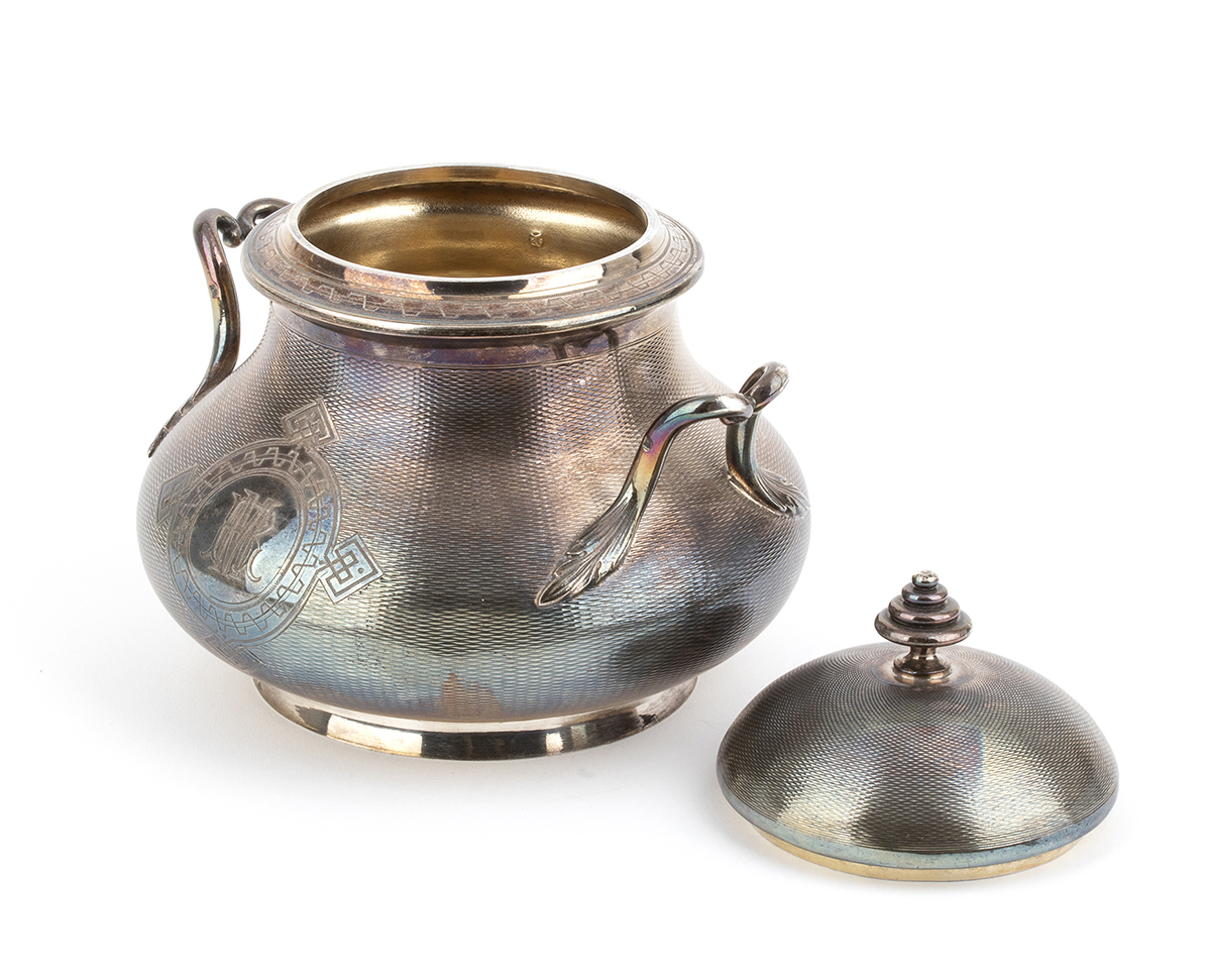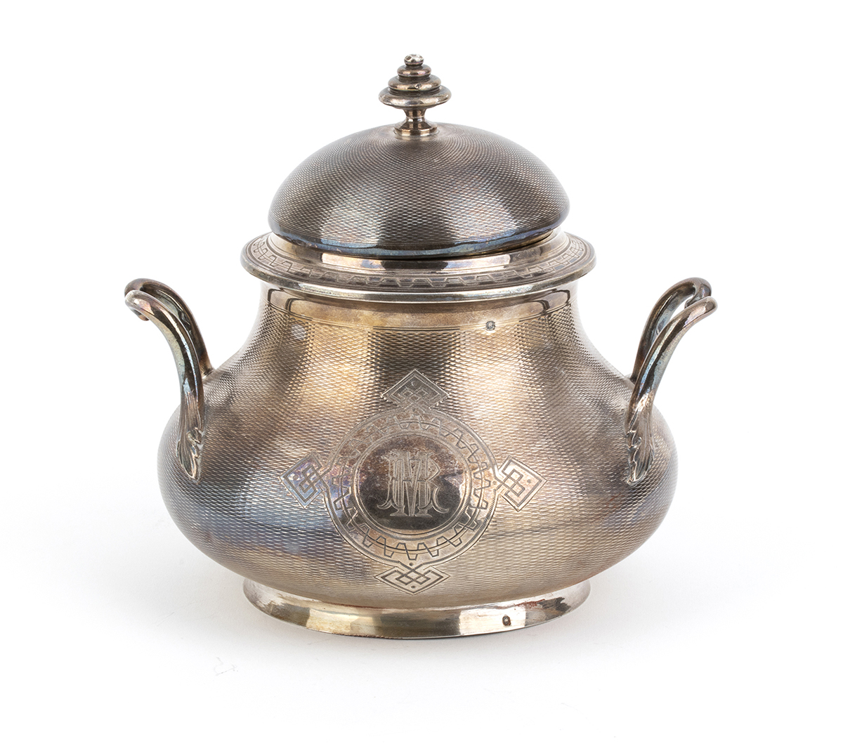 di forma gloubalare con doratura interna e prese laterali, coperchio duomato con cimatura a trottola. Argento 950/100, punzonata con marchi francesi in uso a Parigi dopo il 1838.