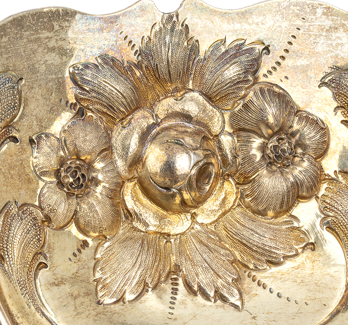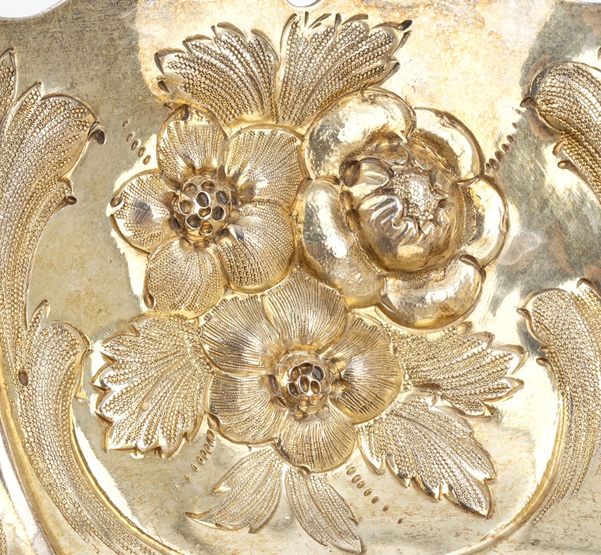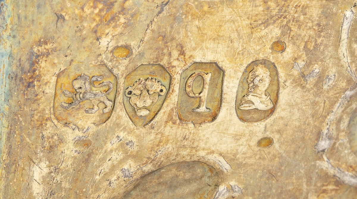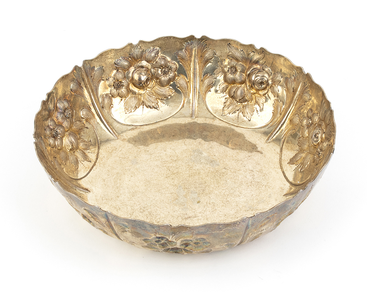 di forma rotonda, il bordo interno sbalzato con decori floreali. Argento 925/1000, serie completa di marchi Londra 1831-1832, argentieri Rundell, Bridge & Rundell (John Bridge).
