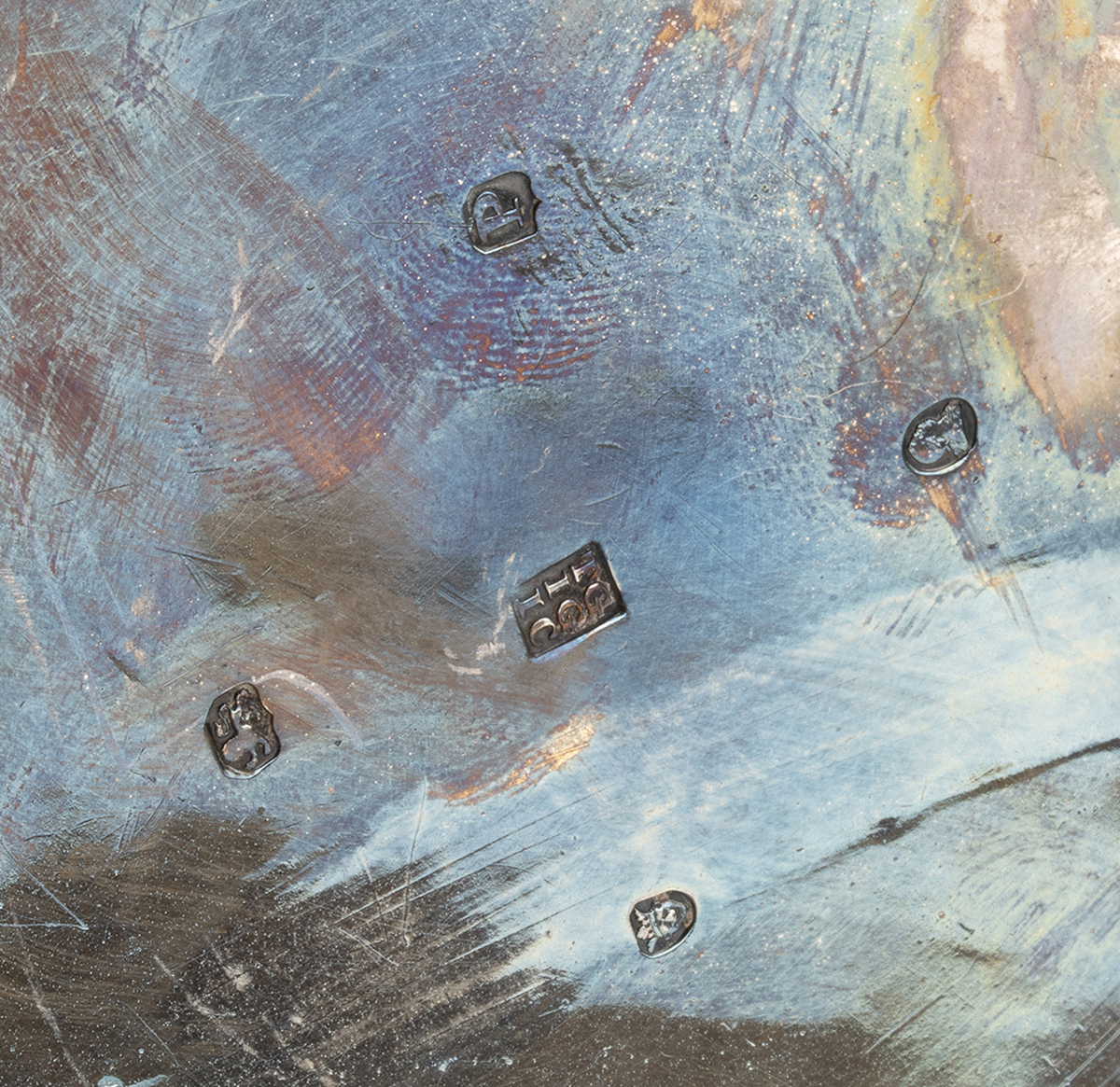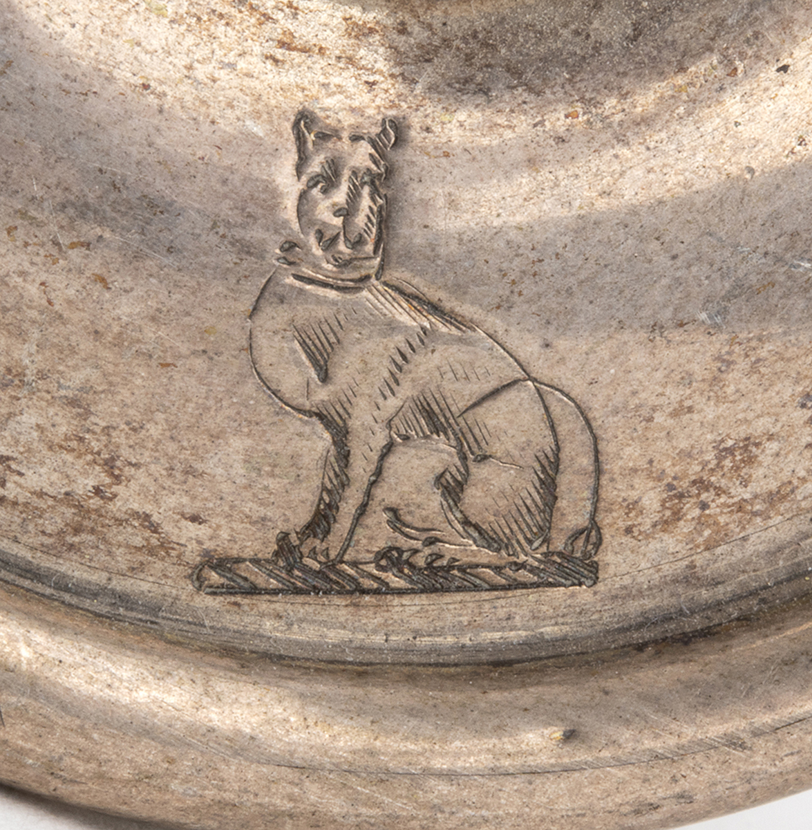 basamento circolare poggiante su quattro piedi felini, corpo liscio con costolature verticali a mezza altezza, manico in legno ebanizzato, coperchio con i medesimi decori e cimatura in osso. Argento 925/1000, serie completa di marchi Londra 1810-1811, argentieri Thomas & Joseph Guest & Joseph Craddock.