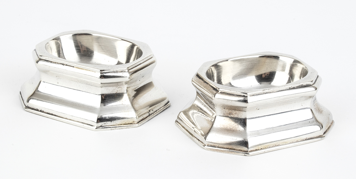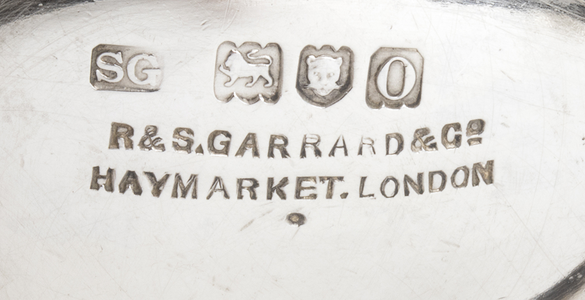 di forma ottagonale. Argento 925/1000, serie completa di marchi Londra 1909-10, argentieri Sebastian Henry Garrard- Garrard & Co Ltd.