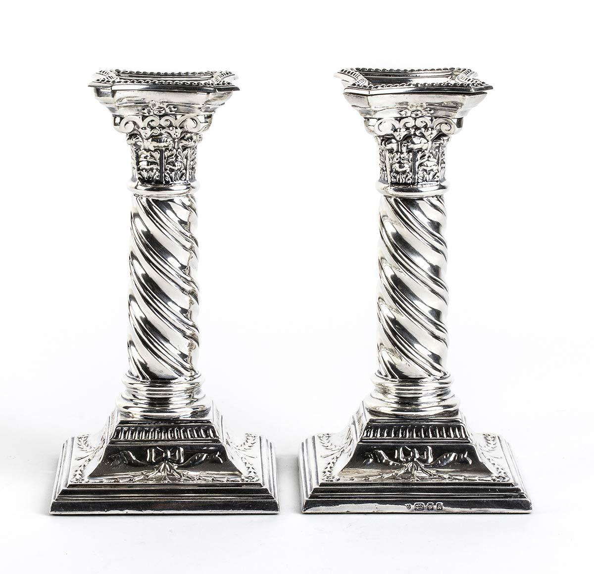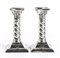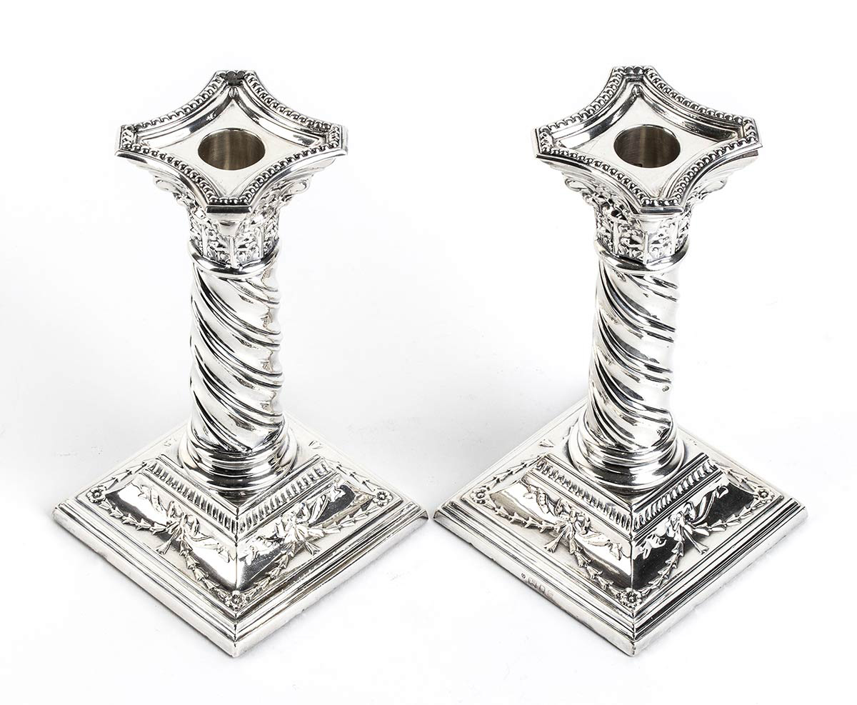 colonna neoclassica tortile su base quadrata, decorata con elementi fogliati e nastri. Portacandele ad urna con piattini salva cera removibili. Argento 925/1000, serie completa di marchi Londra 1968-1969, argentieri D. J. Silver Repairs.