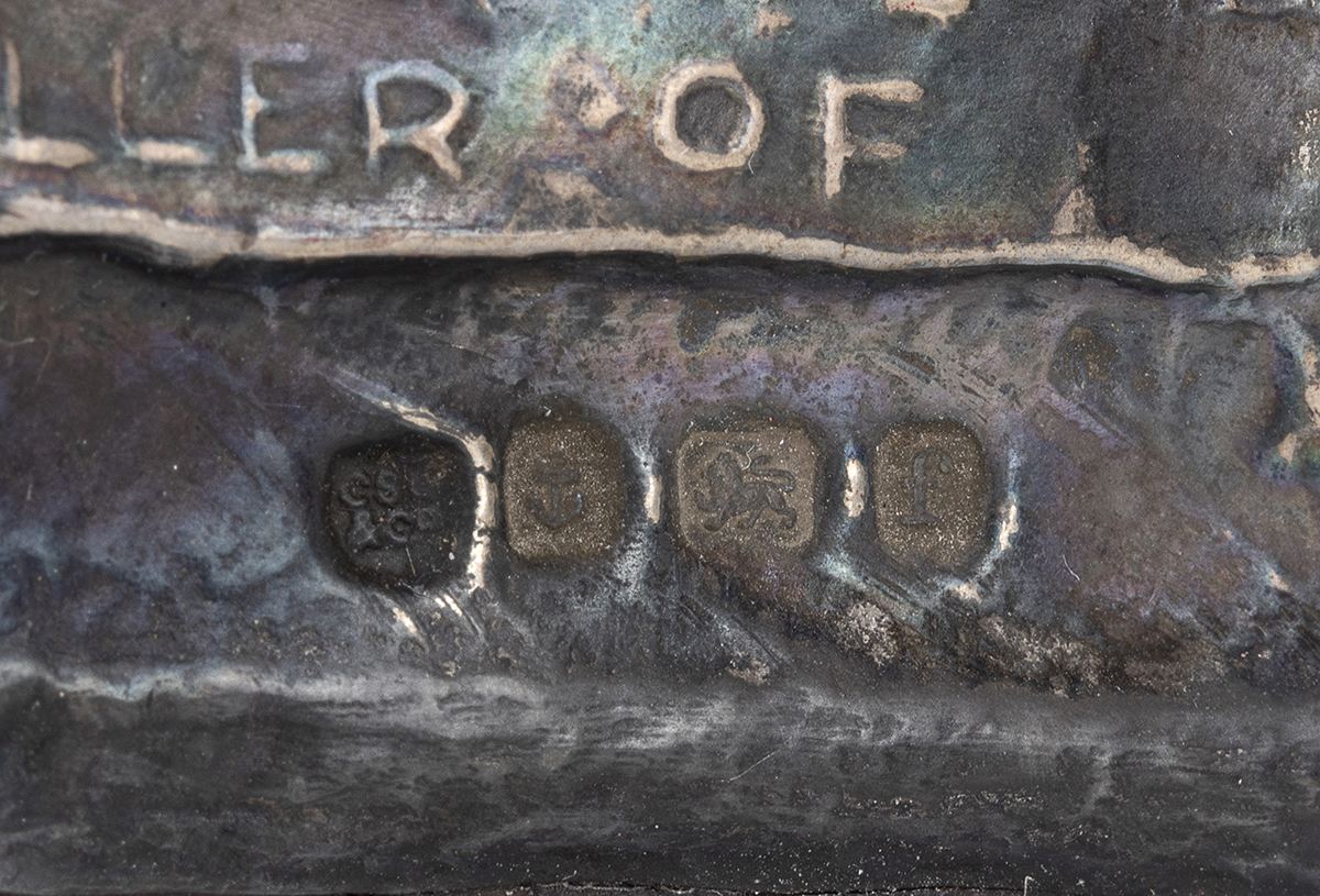 di forma rettangolare raffigurante un mulino con contadini. In basso a destra l'iscrizione "More water glided by the mill than wots the miller of". Argento 925/1000, serie completa di marchi Birmingham 1905-06, argentieri Charles S Green & Co Ltd.