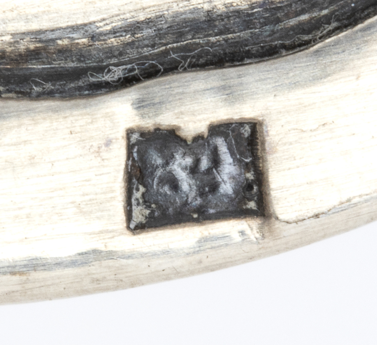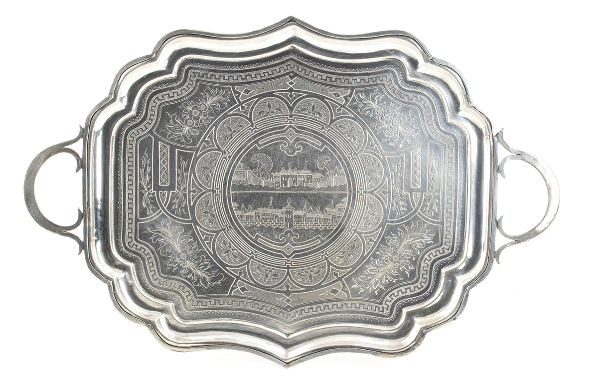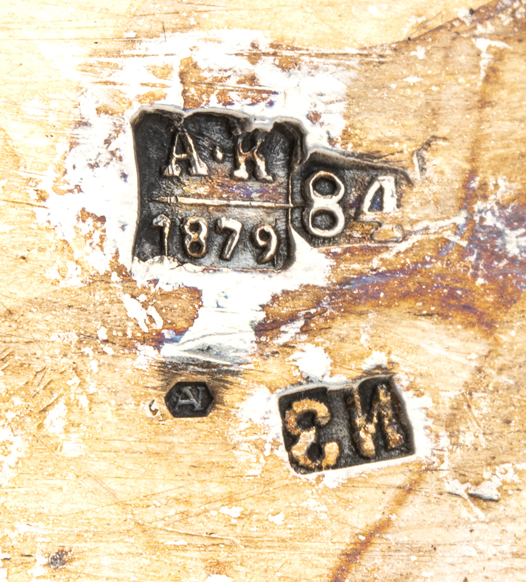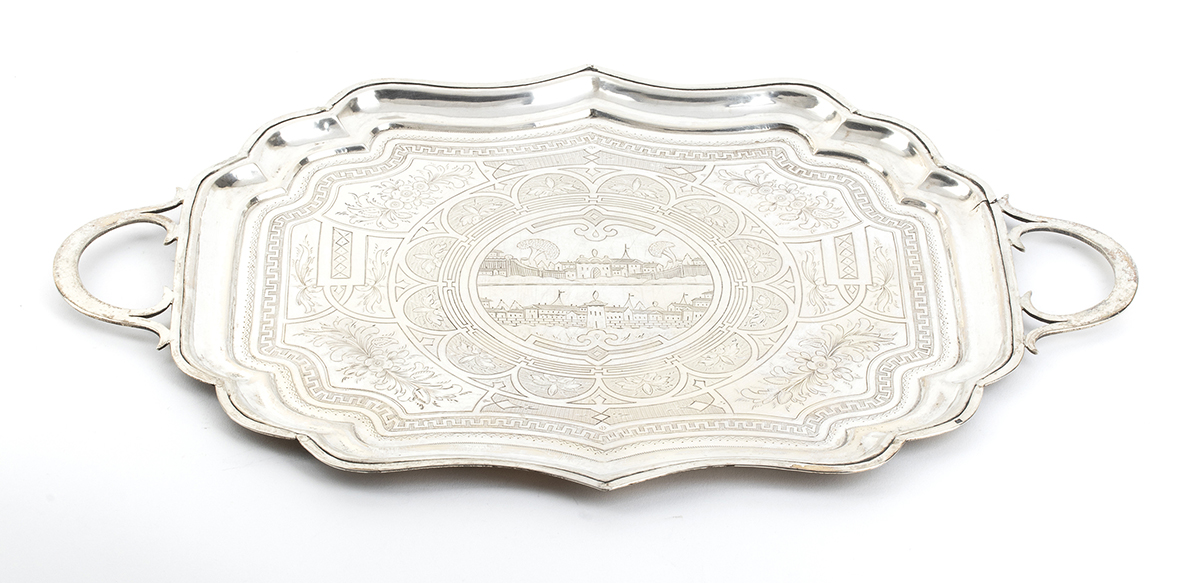 di forma rettangolare con manici laterali, la falda a riserve floreali centrata da una veduta di città. Serie completa di marchi per l'argento al titolo di 84 zolotniks (875/1000) in uso a Mosca nel 1879.