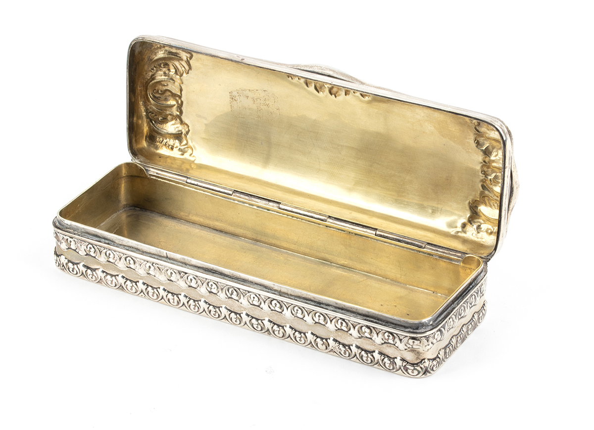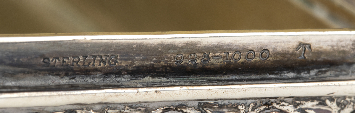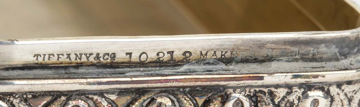 di forma rettangolare, coperchio a decori floreali con monogramma "K G S" e interno dorato. Argento 925/1000, punzonata Tiffany & Co, 1891-1902, presidente Charles L. Tiffany.