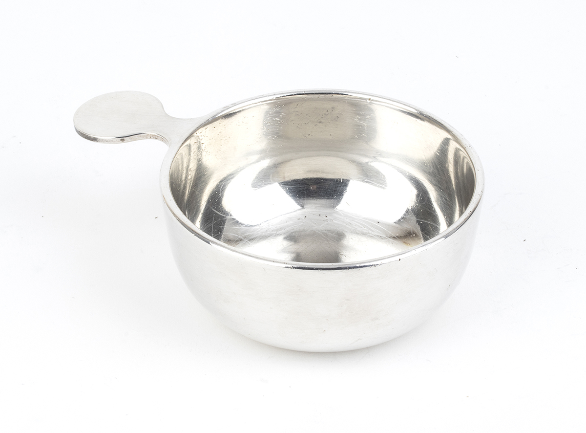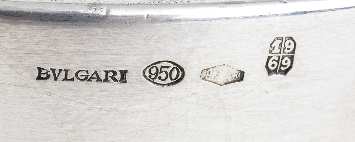 di forma circolare con presa laterale. Argento 950/1000, punzonato "BVLGARI - 950 - 97ROMA - 1969".
