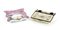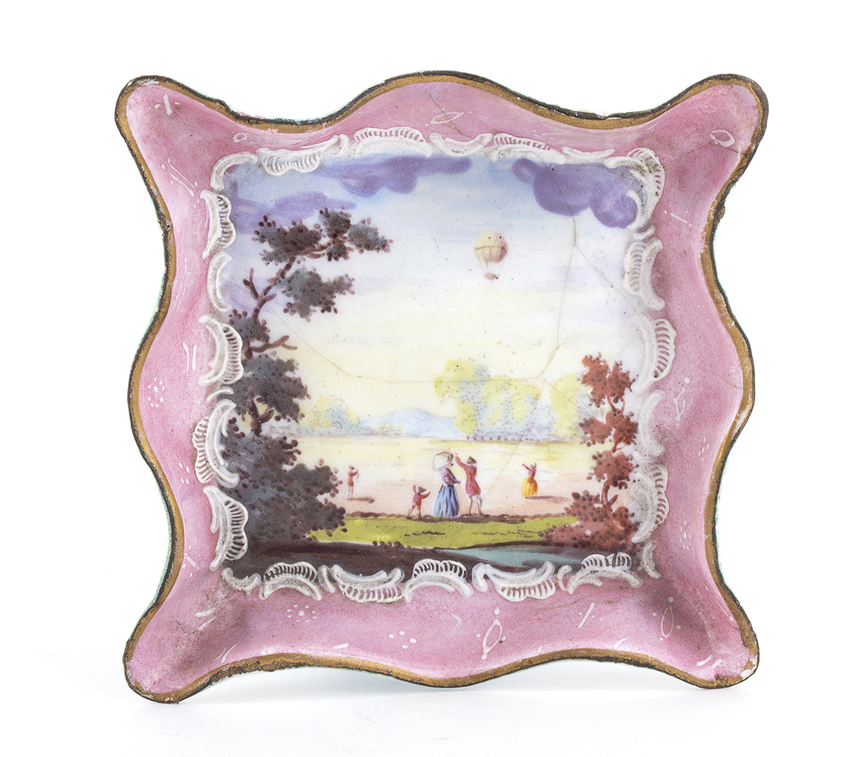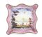 Vassoietto quadrato in metallo smaltato in policromia con fondo rosa e paesaggio, dimensioni 2 x 8,5 x 8,5 cm.