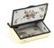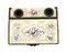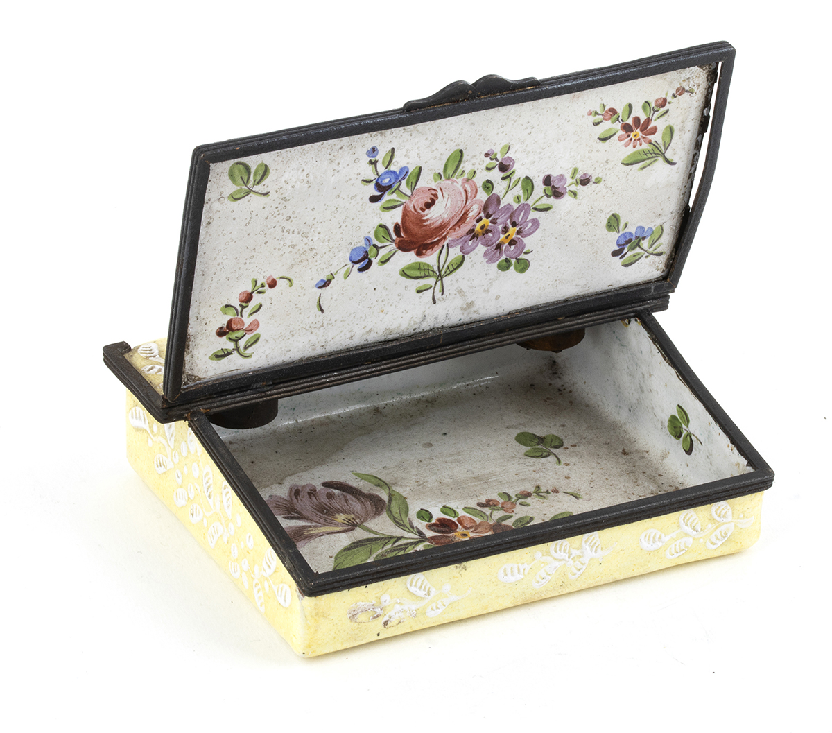 calamaio di forma rettangolare in metallo smaltato in policromia a fondo giallo con decori floreali, dimensioni 2,2 x 8 x 6,3 cm.