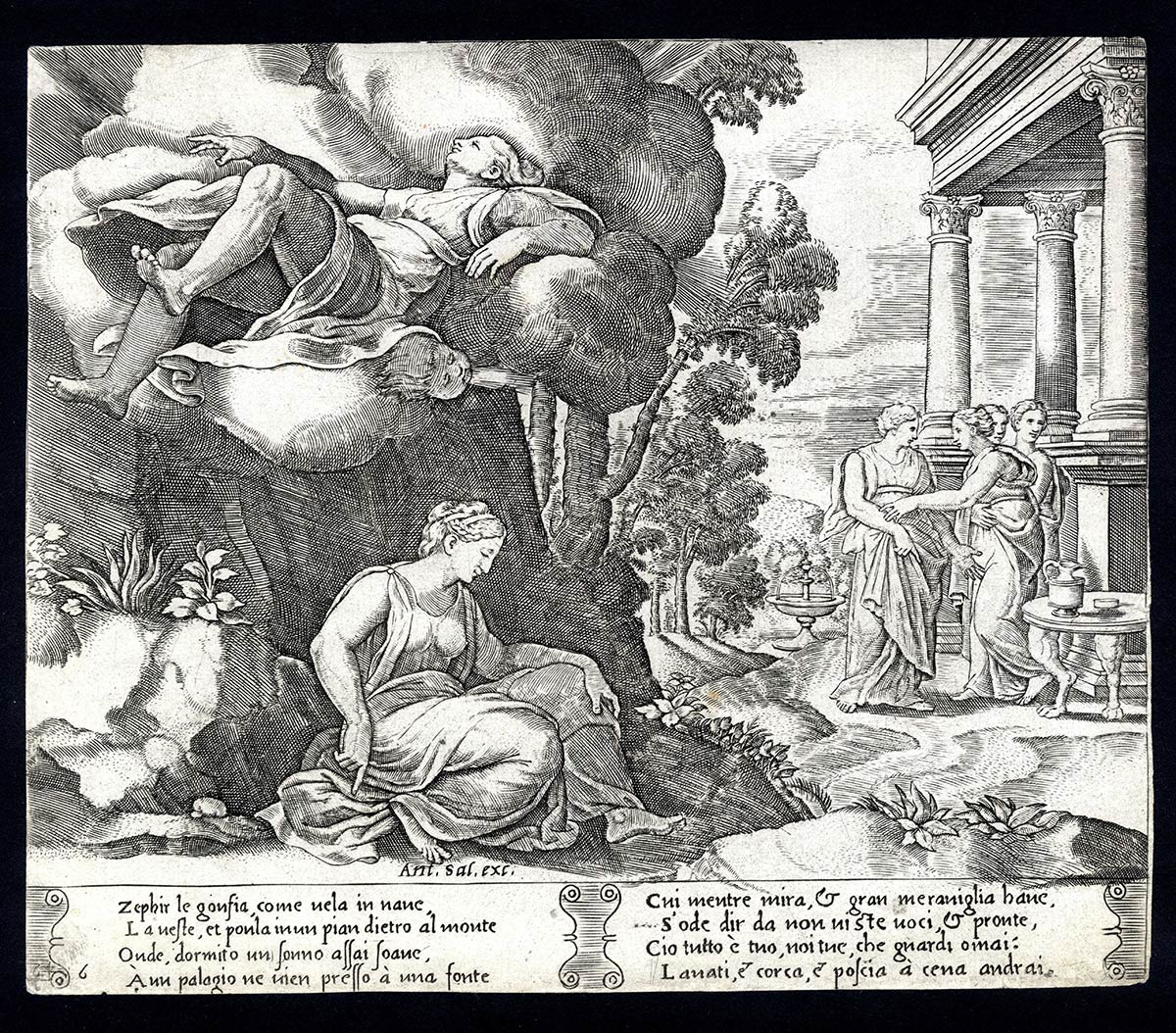 AGOSTINO VENEZIANO (1509-1536) E MAESTRO DEL DADO (ATTIVO A ROMA, - 1560) IV STATO: La Favola di Amore e Psiche: Zefiro porta Psiche al palazzo di Eros
