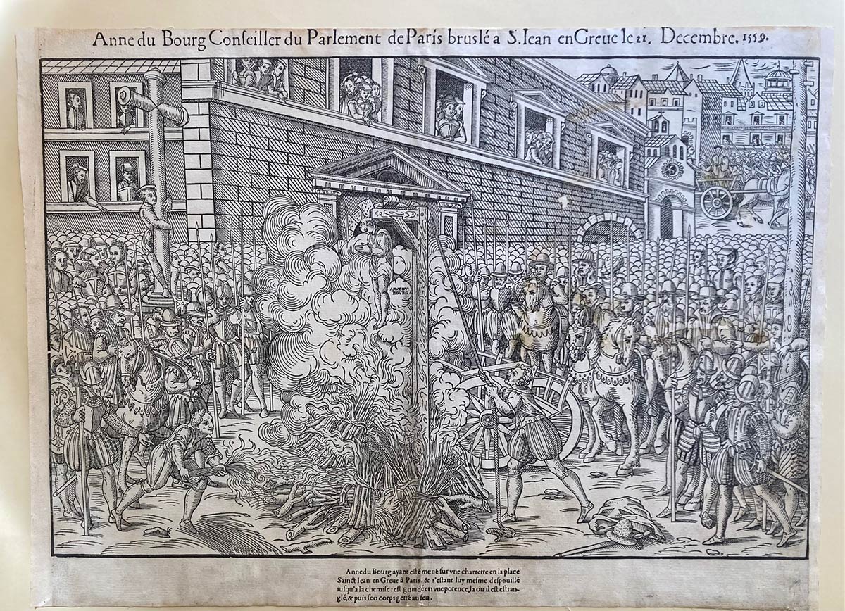 Anne du Bourg bruciata sul rogo; Anne du Bourg, conseiller du Parlement de Paris brûlé a S. Ian en Greue le 21. Decembre 1559