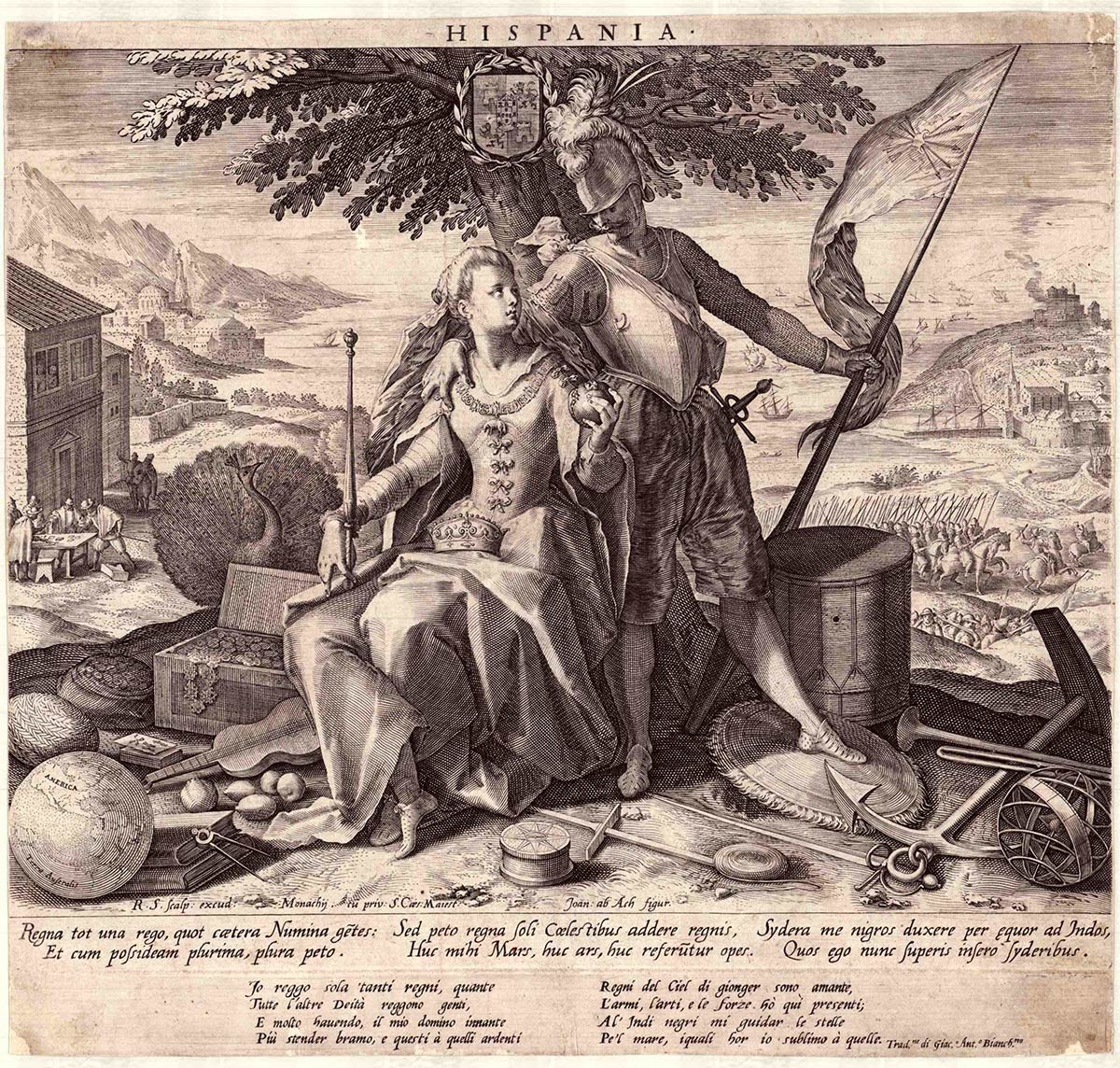 In basso entro inciso “R. S. sculp. excud. Monachij cum privil. S. Caes. Maiest”. In alto fuori inciso il titolo “Hispania”. In basso fuori inciso iscrizione in latino su tre colonne e traduzione in italiano su due colonne di Giacomo Antonio Bianchino. L’incisione fa parte della serie I Quattro Paesi d’Europa edita da Raphael Sadeler I e Jan Sadeler a Monaco di Baviera circa nel 1594.