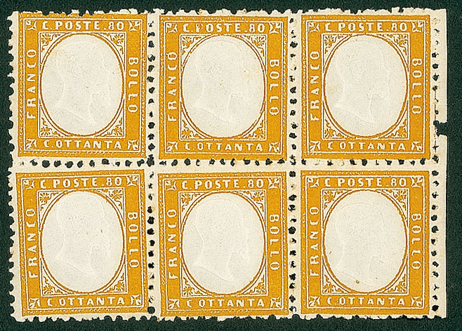 REGNO D'ITALIA - 1862 - 80 cent - blocco di sei bordo foglio - filetto di riquadro nel pezzo superiore destro (pos.5) - gomma integra - Diena (4/4p - 2.600+)