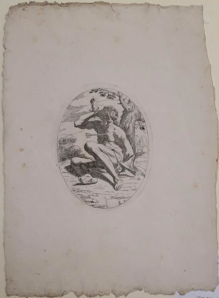 Catalogata da Bartsch come opera di Lorenzo Loli (Bologna 1612-1691) l’incisione è da riferire al Maestro modenese se non altro perché la stessa sigla compare già in altre sue acquaforti che invece non si riscontra nelle grafiche dell’artista bolognese. Eccellenti condizioni del foglio.Bella prova stampata su carta seicentesca con ampi margini.