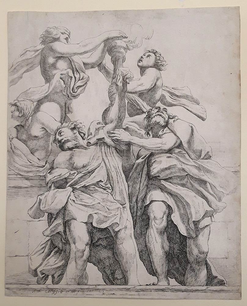 Ottima prova stampata su bella carta vergellata con la filigrana ‘Tre monti sormontati da un giglio nel cerchio’, Briquet n. 1620, Roma 1647 ca. Completa dell’impronta del rame e filomargine nel bordo inferiore. Tracce di pieghe visibili per lo più al recto. Dagli affreschi di Correggio nella cupola del Duomo di Parma, dove dipinse l’Ascensione della Vergine circonadata da Angeli, putti, Santi mentre gli Apostoli collocati su un finto cornicione, assistono all’evento.