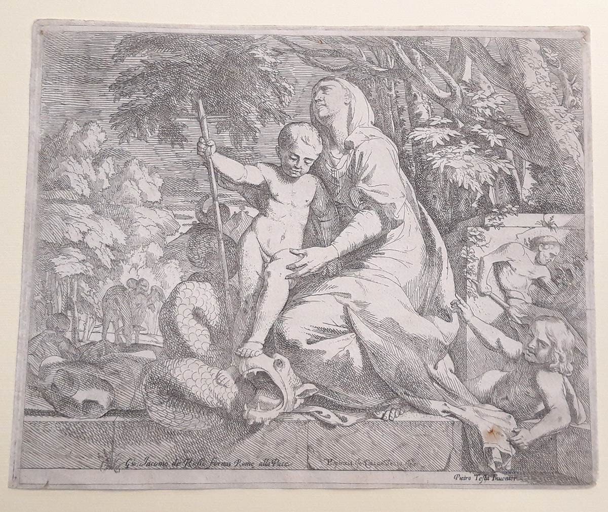 Rara incisione stampata su bella carta con la filigrana ‘Giglio nel cerchio’ simile a Heawood n.1608, Italia XVII secolo. Buone condizioni del foglio completo di filomargine. Piccoli fori lungo i bordi. L’incisione è derivata da un soggetto dello zio Pietro Testa. Timbro di collezione al verso non identificabile.