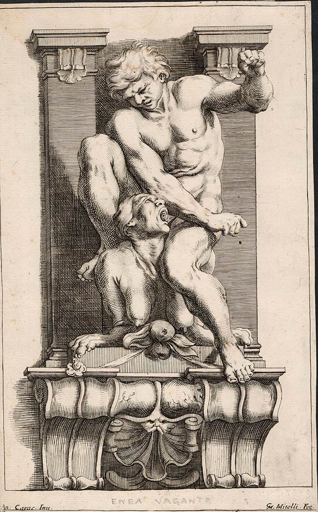 Da una serie raffigurante gli affreschi dei Carracci a Palazzo Fava, Bologna. La serie contiene dodici tavole che riportano le scene dell'Eneide e otto tavole, di cui queste quattro, dei 'termini' che separano gli episodi narrativi e rappresentano i nudi che sottomettono le arpie.