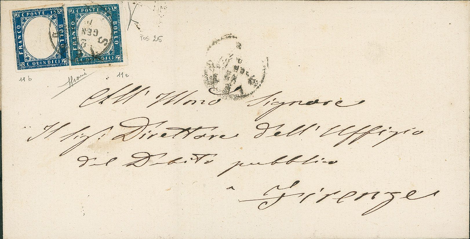 REGNO D'ITALIA - 15 cent azzurro scuro + 15 cent cobalto verdastro carico (pos.25) - i due 15 cent di colori diversi su lettera da Siena a Firenze del 22.1.63 - Sorani + Bottacchi (11b+11h)
