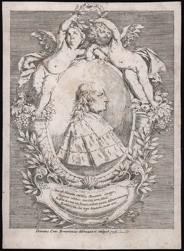 Rara incisione dell’artista cremonese Donato Creti. Raffigura Giovanni Girolamo Sbaralea, medico (1641 - 1710). Datata 1716 in lastra. Bibliografia: De Vesme, Peintre Graveure n. 3