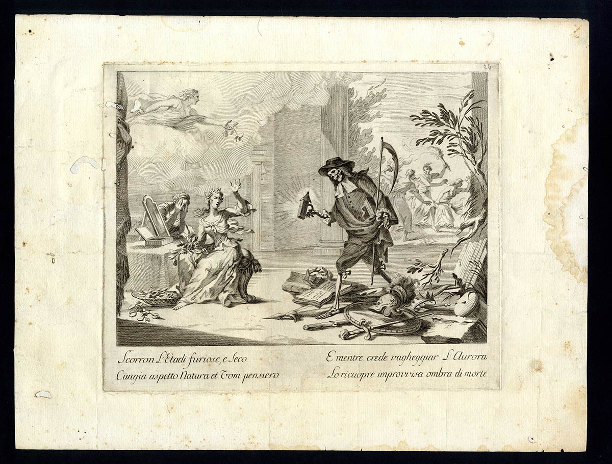 [Scorron l'Etadi furiose, e seco cangia aspetto Natuta et con Pensiero. E mentre crede vagheggiar l'Aurora, lo ricuopre improvvisa ombra di morte] Le vanità terrene messe in fuga dalla Signora con la falce, che cerca con una lanterna quelli il cui tempo terreno è scaduto. Soggetto interessante e non comune.