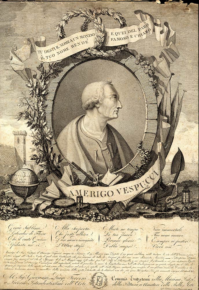 Raro ritratto di Vespucci di profilo, entro una cornice ovale con rami e corone d'alloro e nastro con la dicitura: "Tu desti il nome a un mondo e quei del paro, il tuo nome rendè famoso e chiaro”. Nello sfondo mura cittadine e strumenti geografici come un mappamondo, clessidra, sestante, cannocchiale ed oggetti di marineria. In basso dedicatoria in prosa: [ Genio sublime splendor di flora che il vasto oceaono sfidaste un dì … ] e cenni biografici dell’esploratore scopritore del continente americano. 1760