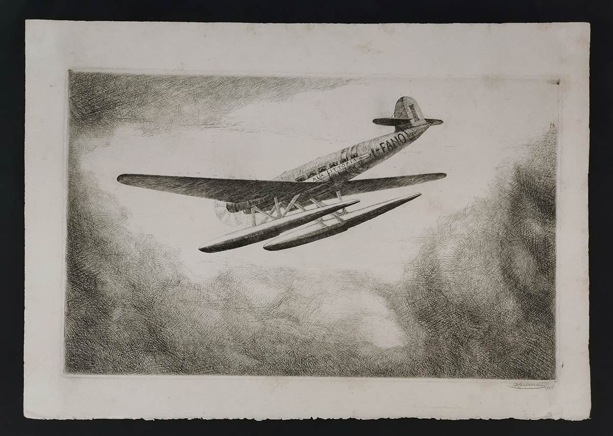 Bella rappresentazione dell’ idrovolante I-FANO dell'Ala Littoria in volo , modello Airone Cant Z.506 Savoia –Marchetti. L'Ala Littoria S.A. fu la prima compagnia aerea di linea italiana, fondata nel 1934 dall’unione di altre compagnie private, ed effettuava servizi di trasporto passeggeri e servizi postali. L’idrovolante entrò in servizio nel 1936 su rotte attorno al mar Mediterraneo, tra cui la linea dell'Impero Roma-Siracusa-Bengasi e la Napoli-Trapani-Tunisi, stabilendo inoltre, tra il 1936 ed il 1938, una serie di record di quota, velocità e distanza, per la sua classe. Antonio Carbonati studiò a Venezia con Ettore Tito e si perfezionò a Roma con Giulio Aristide Sartorio, con cui collaborò nel Fregio del Parlamento a Palazzo Montecitorio. Si dedicò moltissimo alla tecnica dell'acquaforte e dal 1917 realizzò numerose vedute di città italiane, presenti oggi nelle collezioni comunali. Espose nelle maggiori mostre d’arte del periodo, Quadriennale romana, al Salon d'Automne di Parigi e alla Biennale di Venezia, che nel 1942 gli dedicò una personale con oltre 300 opere.