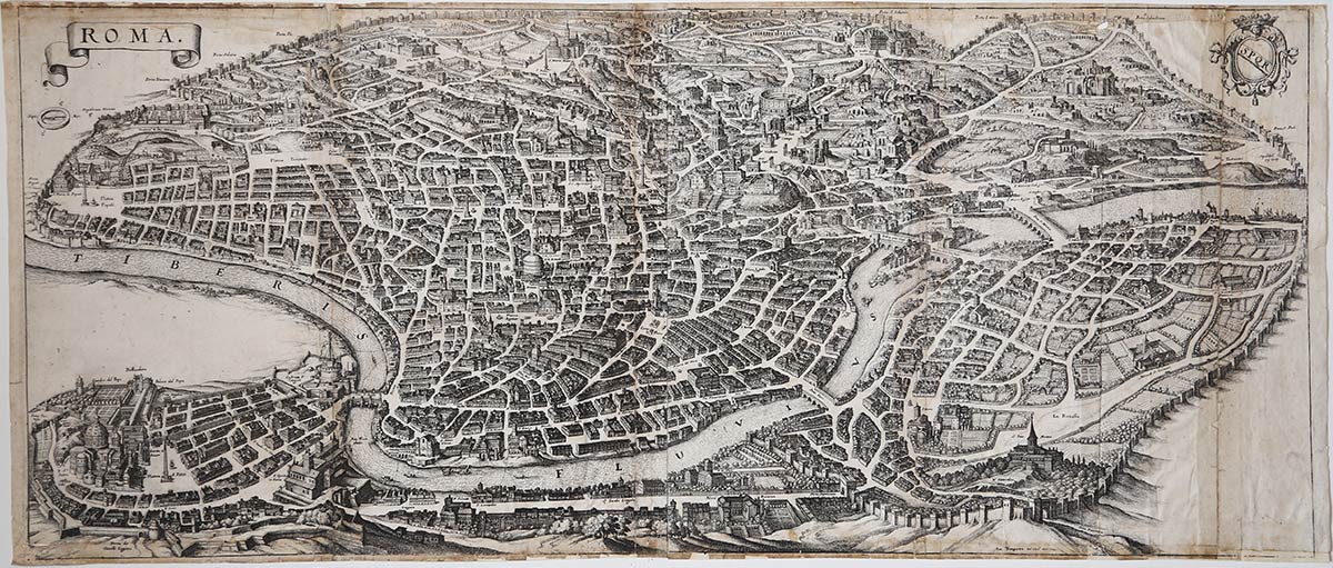 Pianta prospettica pubblicata per la prima volta nell'Itinerario Italiae di Martin Zeiller, stampato a Francoforte nel 1638. La carta è la copia in formato ridotto della grande pianta di Roma realizzata da Antonio Tempesta nel 1593.